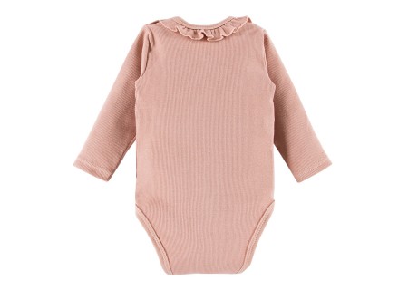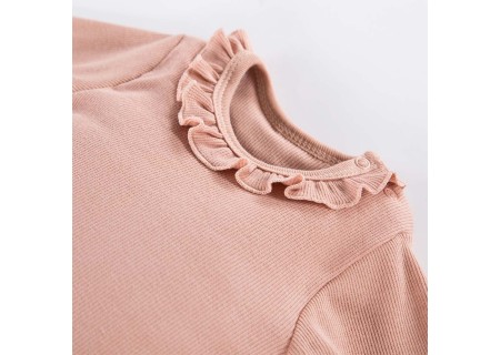 Body dziecięce beżowe w prążek. Elementem ozdobnym jest urocza falbanka. . Mamy najczęściej wybierają body dla swoich maluszków. Jest to must have każdej wyprawki niemowlęcej.
