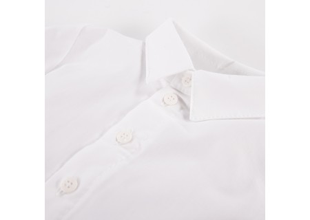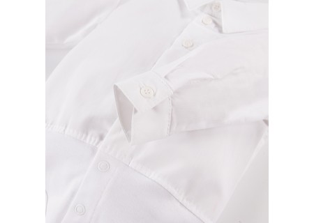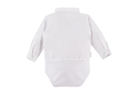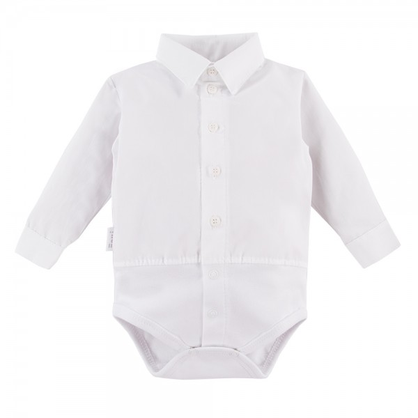 Body chłopięce koszulowe z długim rękawem z kolekcji "Ceremony" uszyte z miękkiej i przyjemnej w dotyku tkaniny w kolorze białym. Dół boda wykonany jest z dzianiny. Część tkaninowa jest zapinana na guziczki. Na części dzianinowej znajdują się praktyczne napki. Krój umożliwia całkowite rozpięcie, przez co ubranko jest funkcjonalne i wygodne. Dół boda wykończony jest miękką lamówką. Napki użyte w naszych wyrobach nie zawierają niklu. Wyprodukowane w Polsce, posiada certyfikat "Bezpieczny dla dziecka". Tkanina: 100% bawełna, dzianina: 100% bawełna