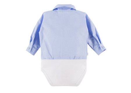 Body chłopięce koszulowe z długim rękawem z kolekcji "Ceremony" uszyte z miękkiej i przyjemnej w dotyku tkaniny w kolorze niebieskim. Dół boda wykonany jest z dzianiny. Część tkaninowa jest zapinana na guziczki. Na części dzianinowej znajdują się praktyczne napki. Krój umożliwia całkowite rozpięcie, przez co ubranko jest funkcjonalne i wygodne. Dół boda wykończony jest miękką lamówką. Napki użyte w naszych wyrobach nie zawierają niklu. Wyprodukowane w Polsce, posiada certyfikat "Bezpieczny dla dziecka". Tkanina: 100% bawełna, dzianina: 100% bawełna