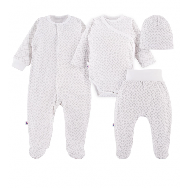 Komplet wyprawkowy 4-częściowy uszyty z miękkiej i przyjemnej w dotyku dzianiny bawełnianej. W skład kompletu wyprawkowego wchodzi body, półśpioch, pajacyk oraz czapeczka. Elemetami ozdobnymi kompletu są nadruki gwiazdek oraz wszywka sygnetu Eevi. Krój każdego ubranka umożliwia rozpięcie na całej długości oraz w kroczku, dzięki temu ubranka są funkcjonalne i wygodne. Półśpioszki w pasie posiadają bezuciskowy ściągacz. Komplety niemowlęce idealnie sprawdzają się w pierwszych miesiącach życia dziecka. Świetnie sprawdzą się do szpitala. Klienci czesto kupują gotowe komplety na prezent dla maluszka.