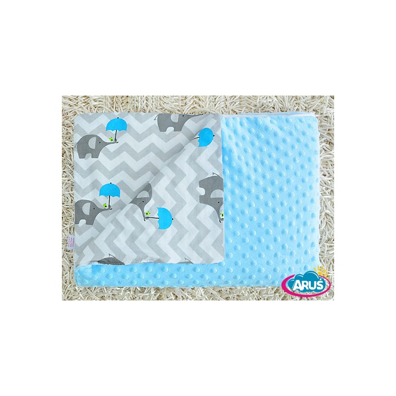 Modny i komfortowy kocyk MINKY wykonany z najwyższej jakości polaru i bawełny. Tutaj dostępny jest wzór ze słonikami z niebieskimi parasolkami oraz z niebieskim polarem. Doskonały dodatek – do przykrycia maluszka, do wózka, jako dekoracja do pokoju dziecięcego. Będzie też świetnym pomysłem na prezent!