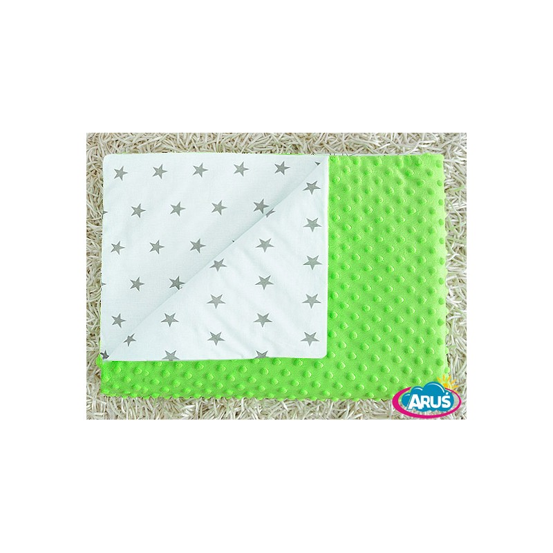 Ciepły i miękki, dwustronny kocyk MINKY z polaru i bawełny w uroczym, modnym wzorze. Tutaj oferujemy kocyk z szarymi gwiazdkami na białym tle oraz z zielonym polarem. Wielofunkcyjny – doskonały do przykrycia dziecka, do wózka, do zabawy, ale też jako upominek i dekoracja do pokoju dziecięcego.