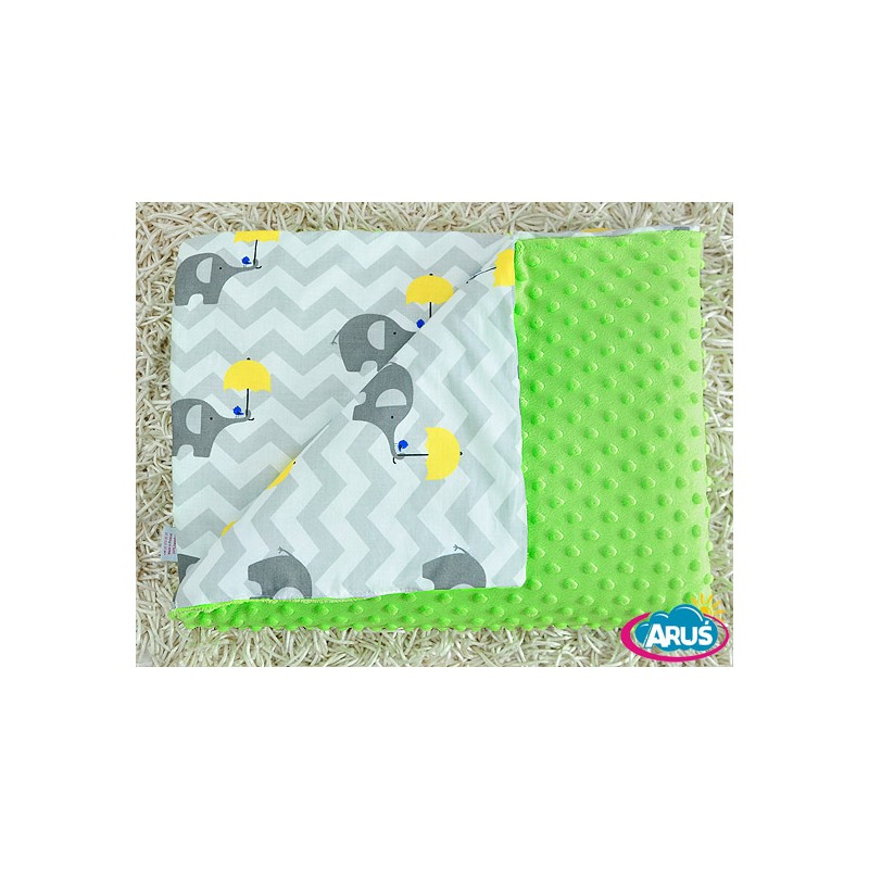 Dwustronny kocyk MINKY z polaru i bawełny – ciepły, miękki, w uroczym, modnym wzorze. Tutaj dostępny jest kocyk z szarymi słonikami z żółtymi parasolkami oraz z zielonym polarem. Ma wiele zastosowań – do wózka, do łóżka dziecięcego, do zabawy, ale też jako prezent i ozdoba do pokoju dziecięcego.