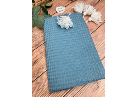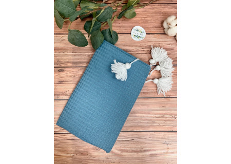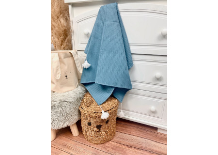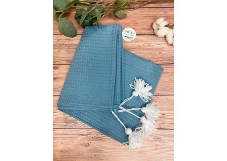 Koc / kocyk wafelek 75x100 Boho collection deep blue pompons