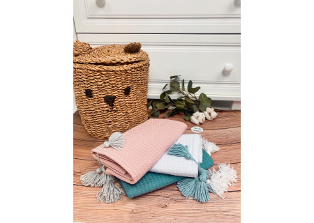 Kocyk z najnowszej kolekcji BOHO doskonale sprawdzi się w domu, w podróży i na spacerze. Wykonany jest w 100% z bawełny o wyjątkowym, wafelkowym splocie. Charakterystyczny splot sprawia, że kocyk jest przewiewny i idealnie nadaje się na letnie dni. Kocyk w swoich czterech rogach jest wykończony wykonanymi ręcznie mulinowymi pomponami.