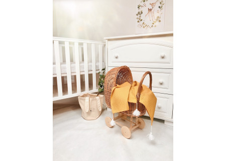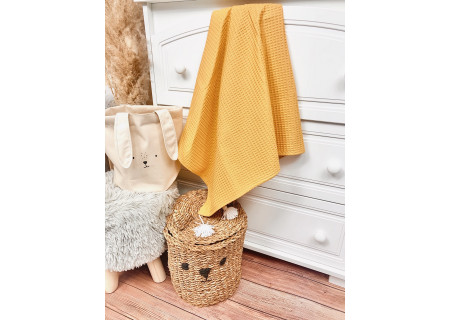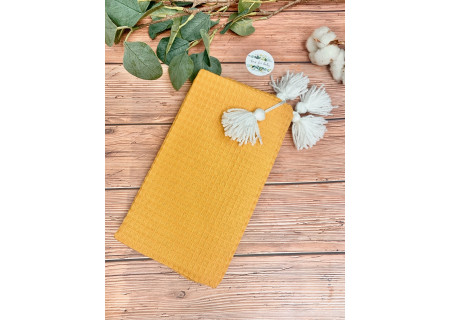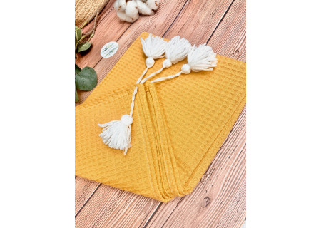Koc / kocyk wafelek 75x100 Boho collection mustard pompons