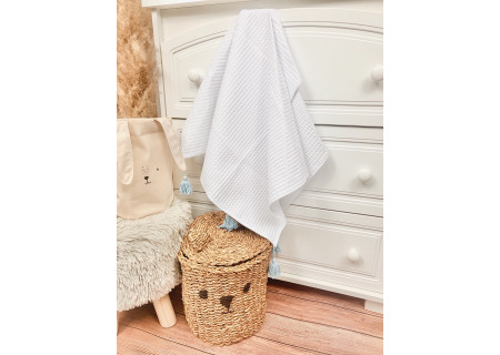 Koc / kocyk wafelek 75x100 Boho collection white and blue pompons