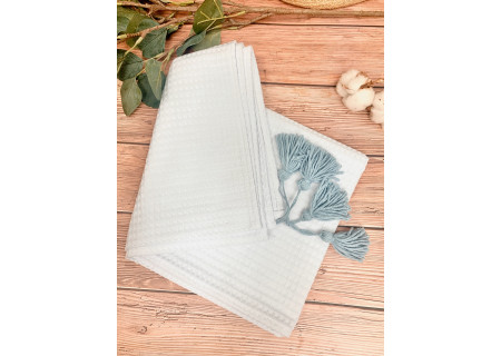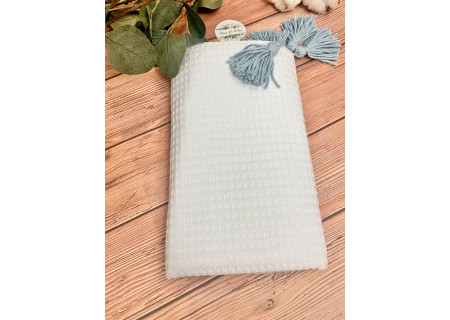 Koc / kocyk wafelek  75x100 Boho collection white and blue pompons