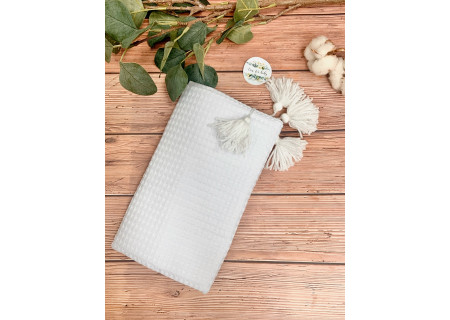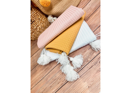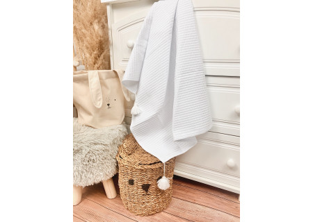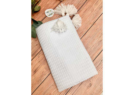 Koc / kocyk wafelek 75x100 Boho collection white pompons