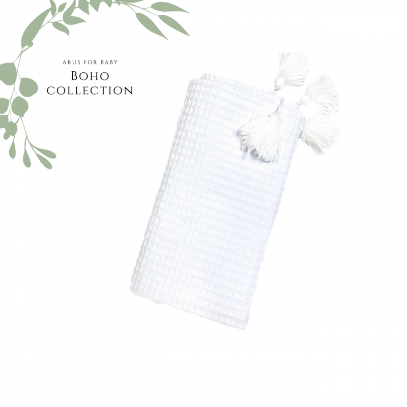 Kocyk z najnowszej kolekcji BOHO doskonale sprawdzi się w domu, w podróży i na spacerze. Wykonany jest w 100% z bawełny o wyjątkowym, wafelkowym splocie. Charakterystyczny splot sprawia, że kocyk jest przewiewny i idealnie nadaje się na letnie dni. Kocyk w swoich czterech rogach jest wykończony wykonanymi ręcznie mulinowymi pomponami.