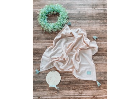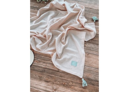 Kocyk z kolekcji Eco Muśln, wykonany z niezwykle delikatnego bawełnianego muślinu. Tkanina posiada unikatowe, drobne zdobienia. Dodatkowo kocyk w każdym z rogów posiada ręcznie wykonane, bambusowe pompony.