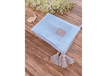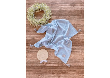 Kocyk z kolekcji Eco Muśln, wykonany z niezwykle delikatnego bawełnianego muślinu. Tkanina posiada unikatowe, drobne zdobienia. Dodatkowo kocyk w każdym z rogów posiada ręcznie wykonane, bambusowe pompony.