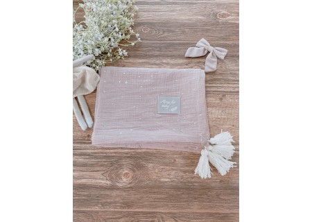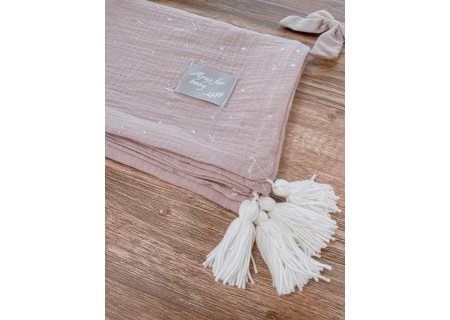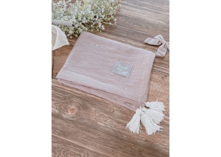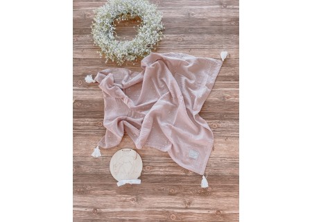 Kocyk z kolekcji Eco Muśln, wykonany z niezwykle delikatnego bawełnianego muślinu. Tkanina posiada unikatowe, drobne zdobienia. Dodatkowo kocyk w każdym z rogów posiada ręcznie wykonane, bambusowe pompony.