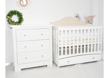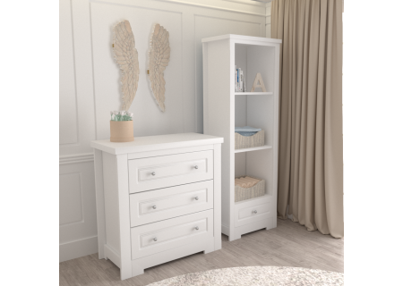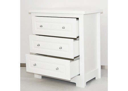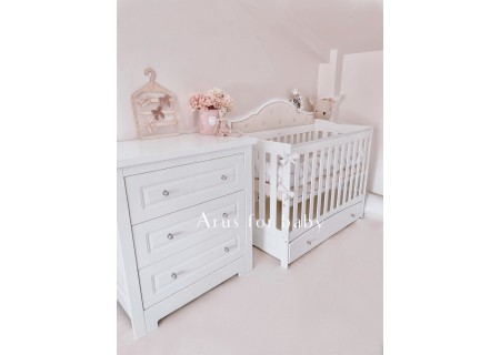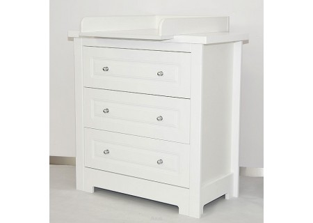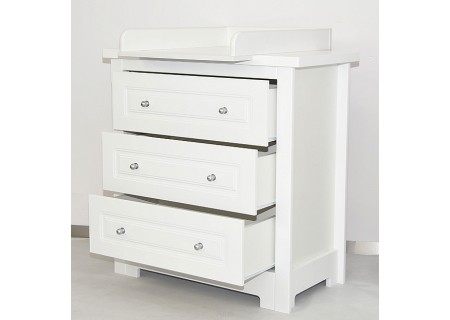 Komoda wykonana została w całości z płyty meblowej i płyty MDF w białym kolorze stanowi idealna parę do łóżeczka Carmen