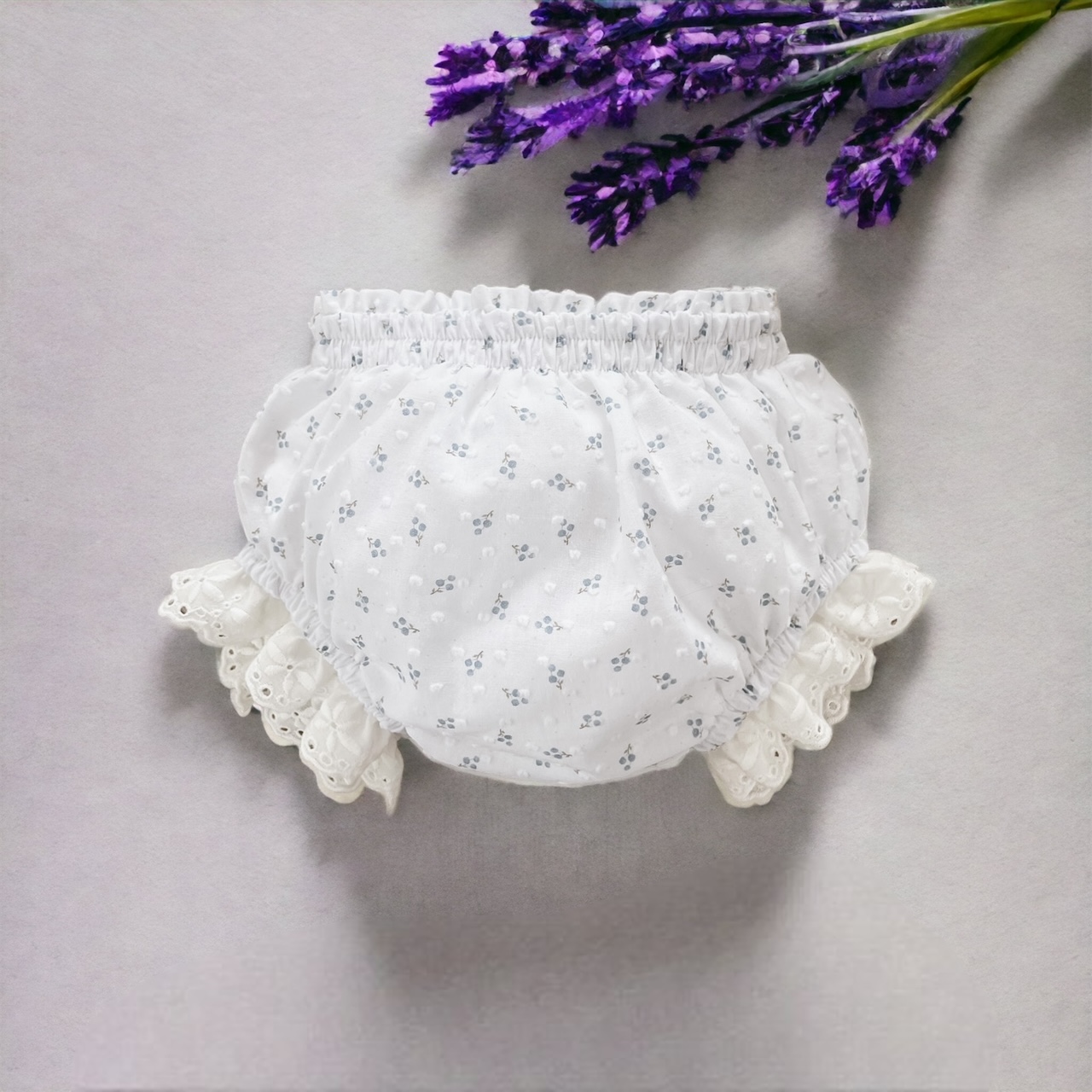2. Bawełniane bloomersy z haftowanymi falbankami.