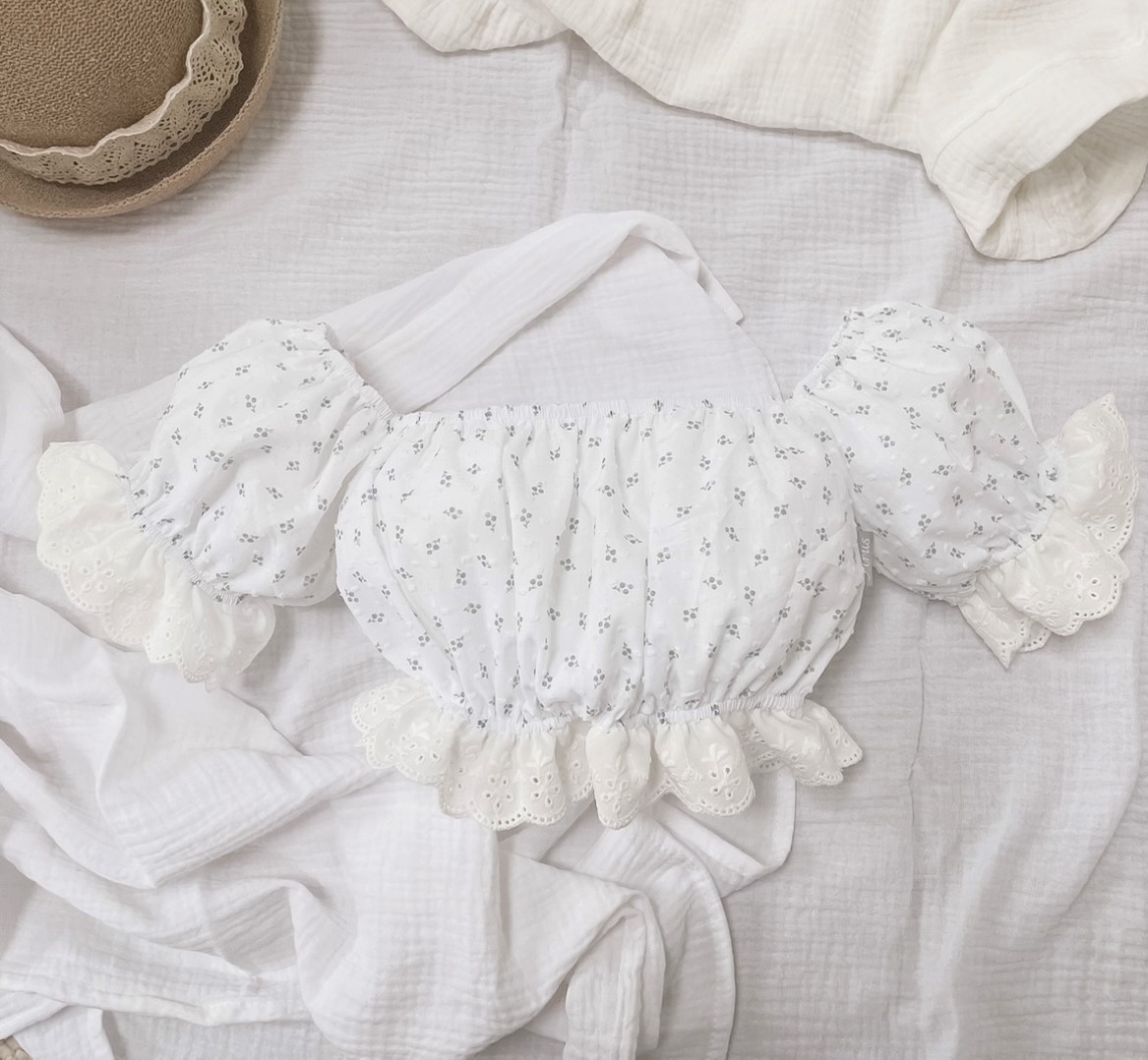 1.Top typu hiszpanka z bufiastymi rękawami, które zostały ozdobione haftowaną falbanką w kolorze kremowym. Dzięki zastosowaniu gumek dopasowuje się do kształtu i rozmiaru ciała.