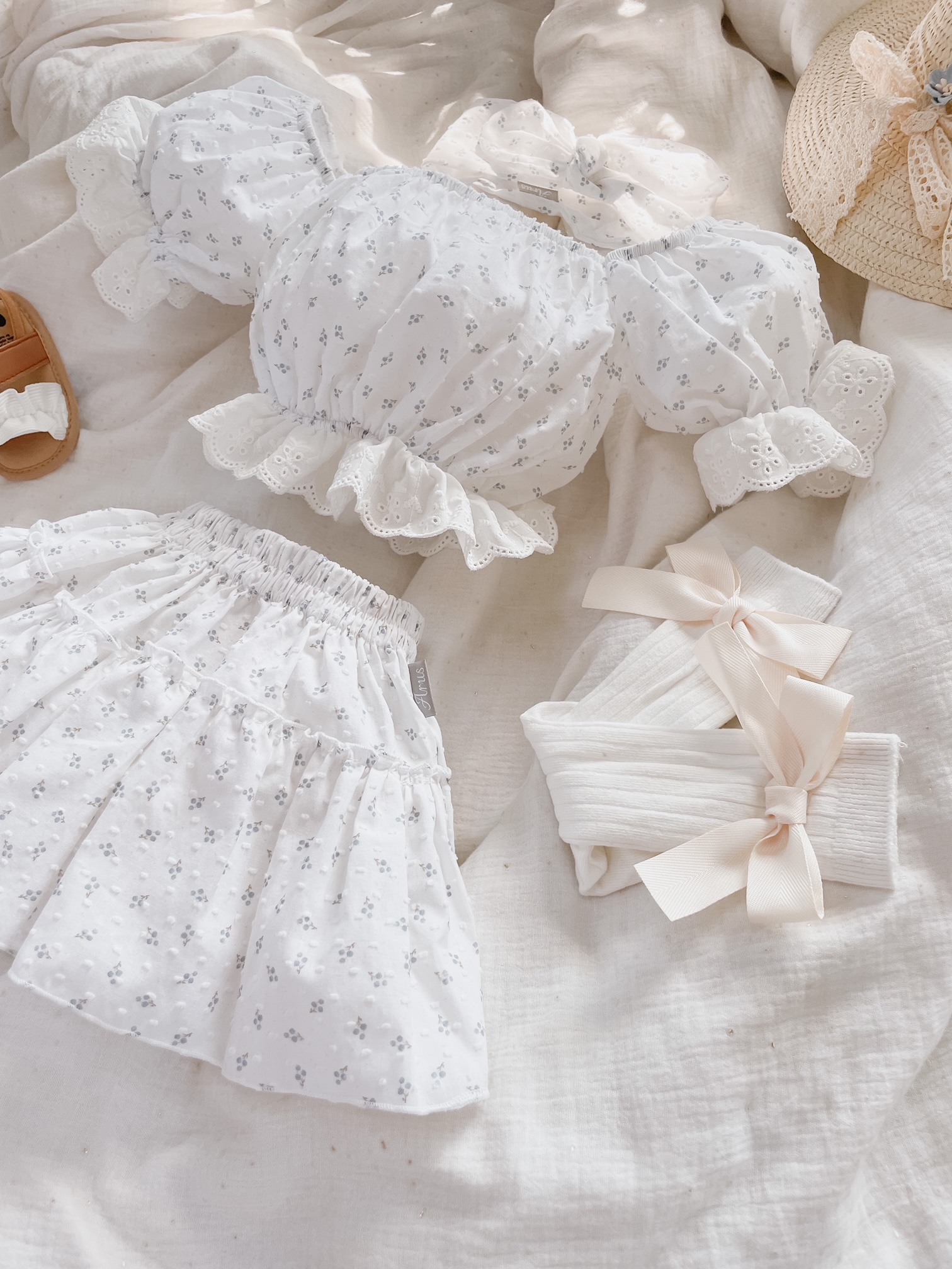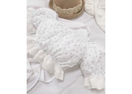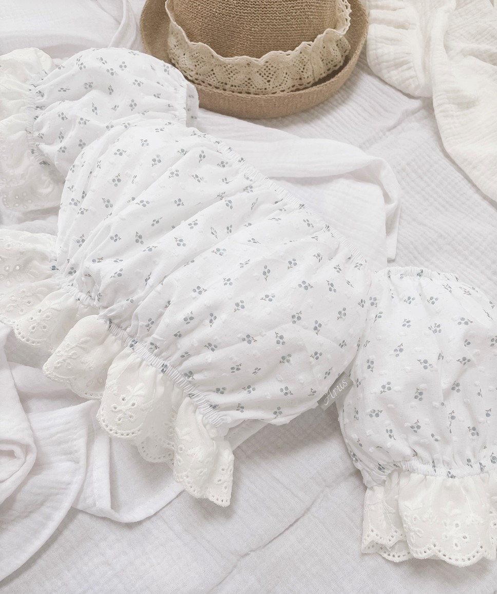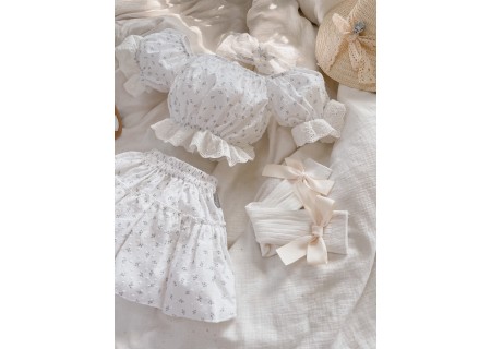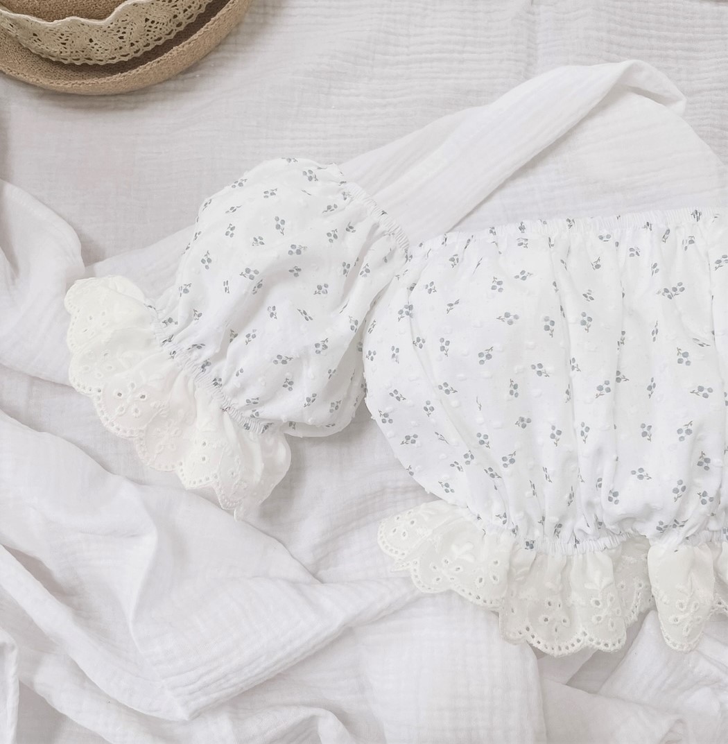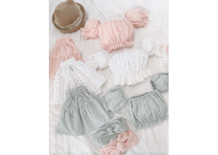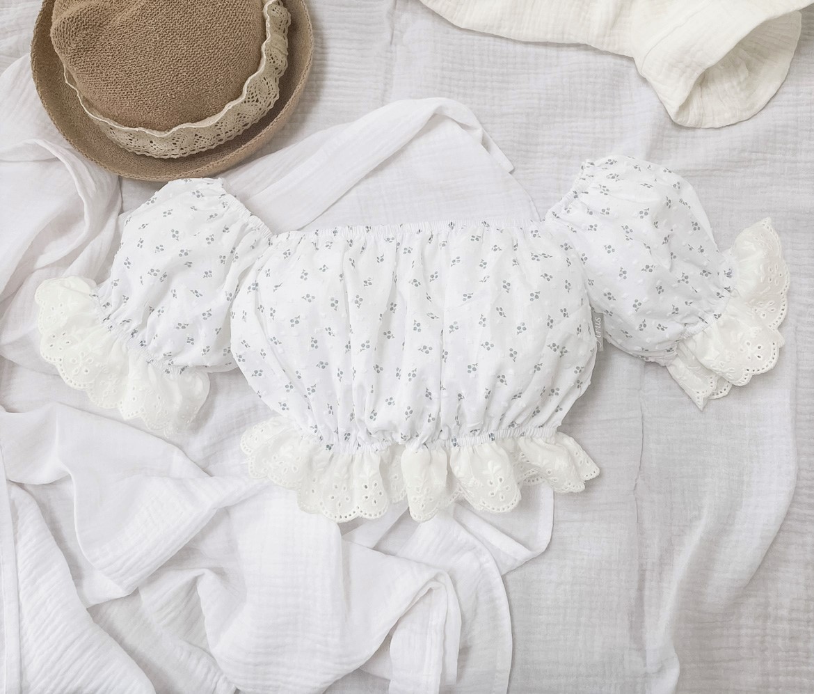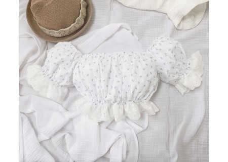 1.Top typu hiszpanka z bufiastymi rękawami, które zostały ozdobione haftowaną falbanką w kolorze kremowym. Dzięki zastosowaniu gumek dopasowuje się do kształtu i rozmiaru ciała.