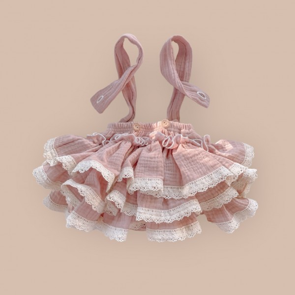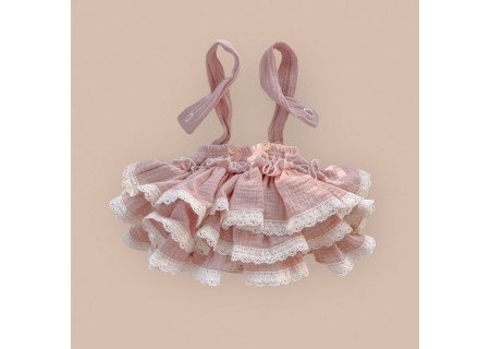 2. SPÓDNICA/ BLOOMERSY NA SZELKACH Z FALBANKAMI I KORONKĄ LOVELY LINE MUŚLINOWA PUDROWY RÓŻ