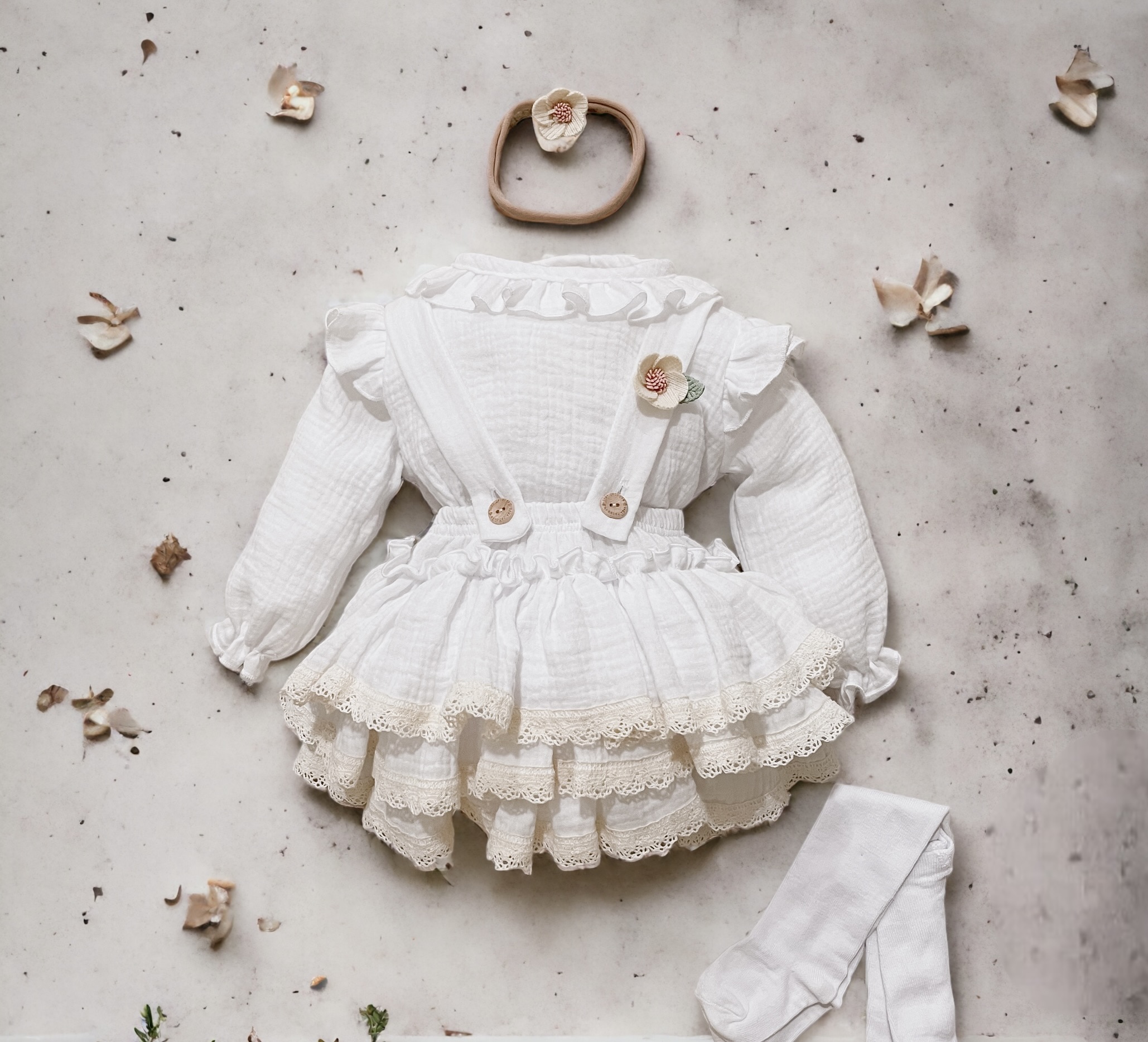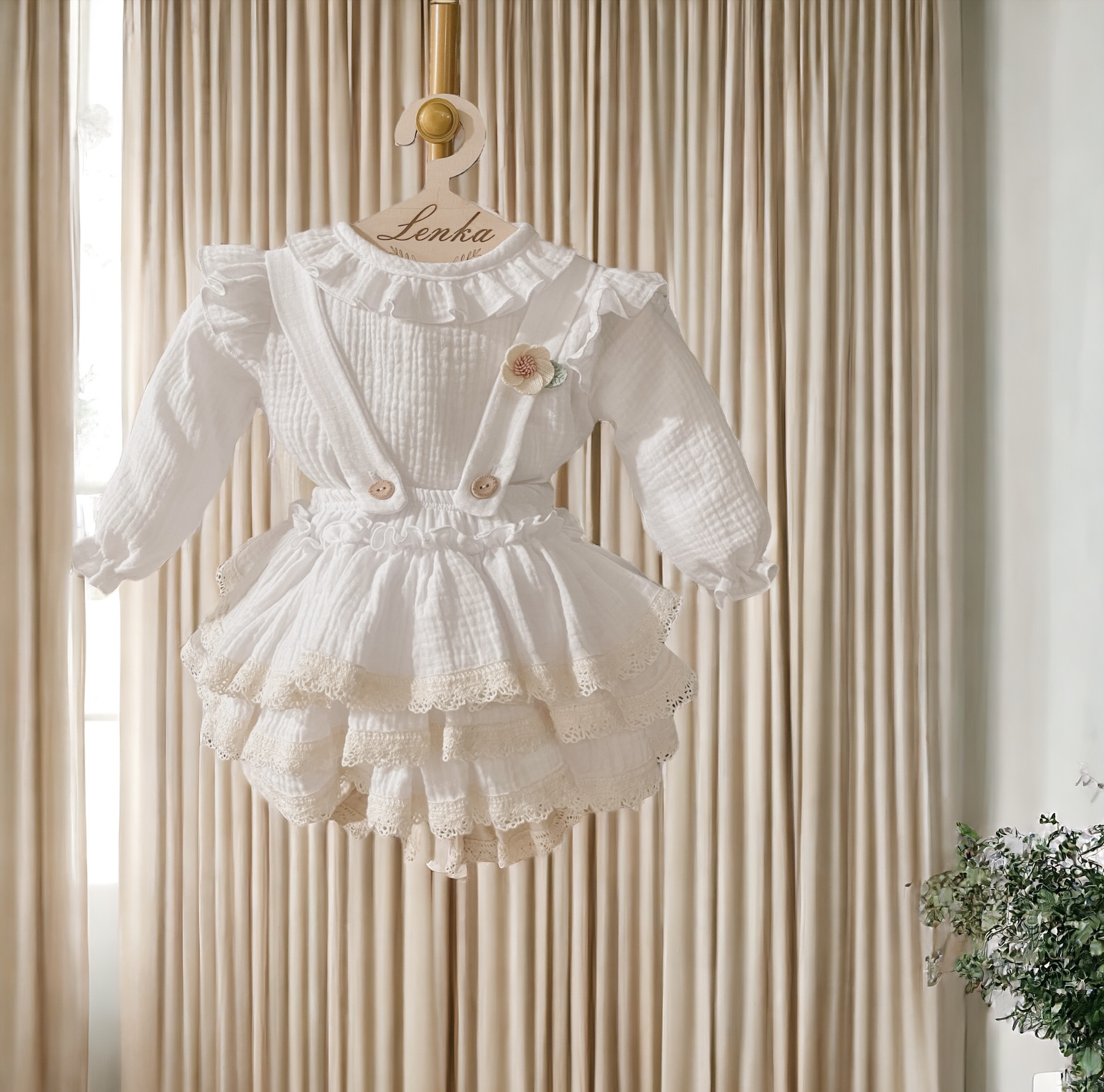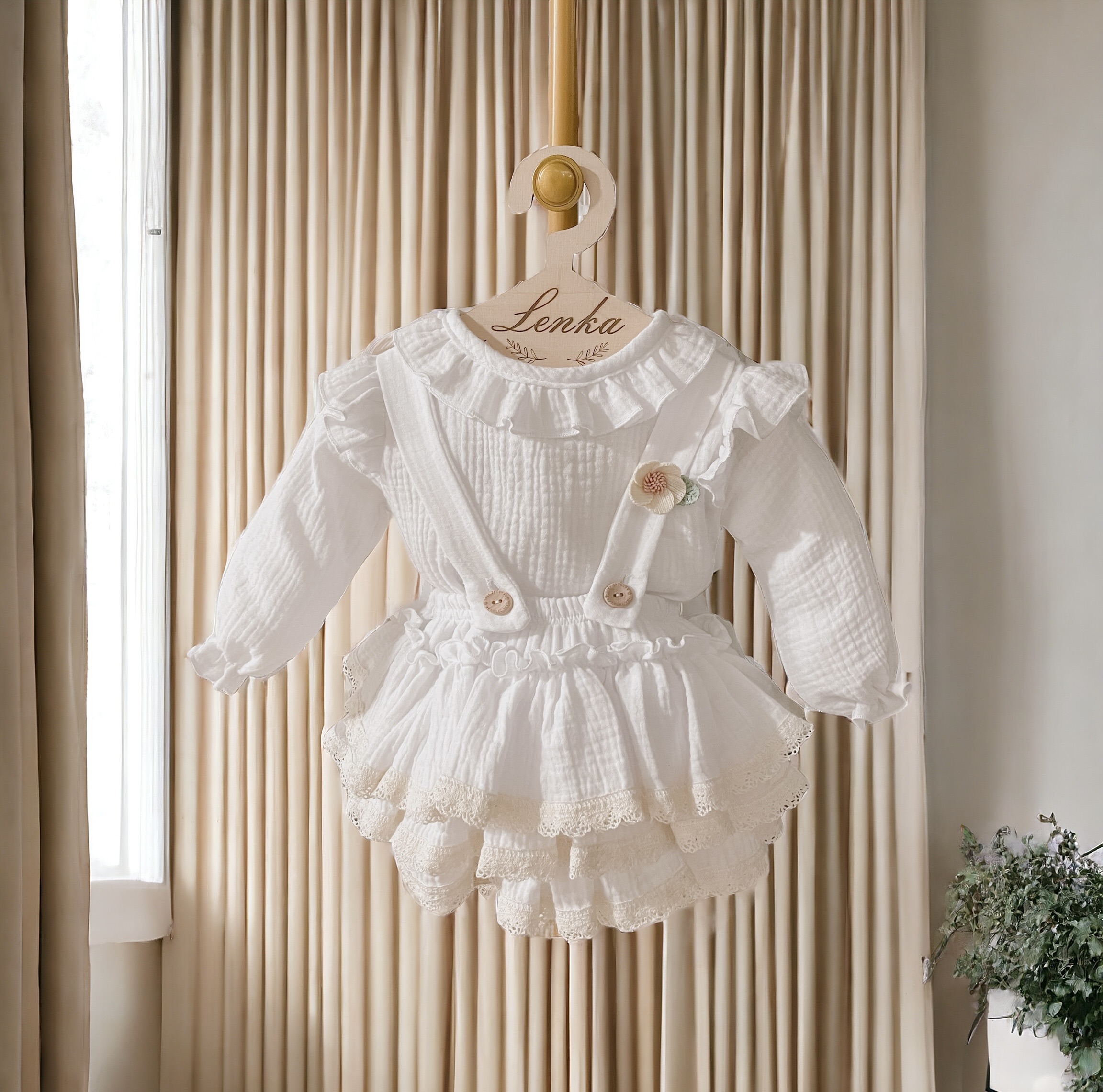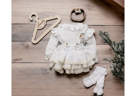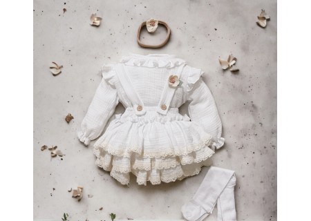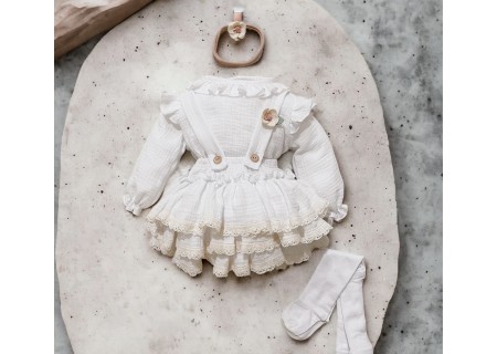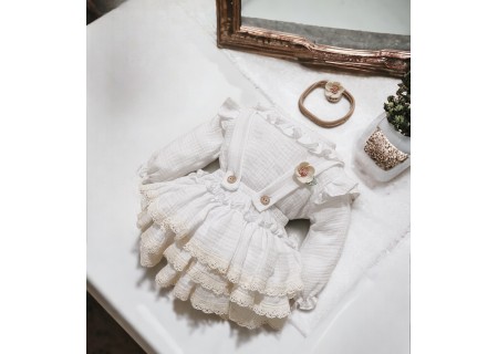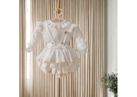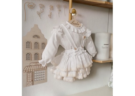 Spódniczka z trzech falban na szelkach uszyta z bawełnianego muślinu, wiązana z tyłu na kokardkę . Produkt posiada wszyte majteczki