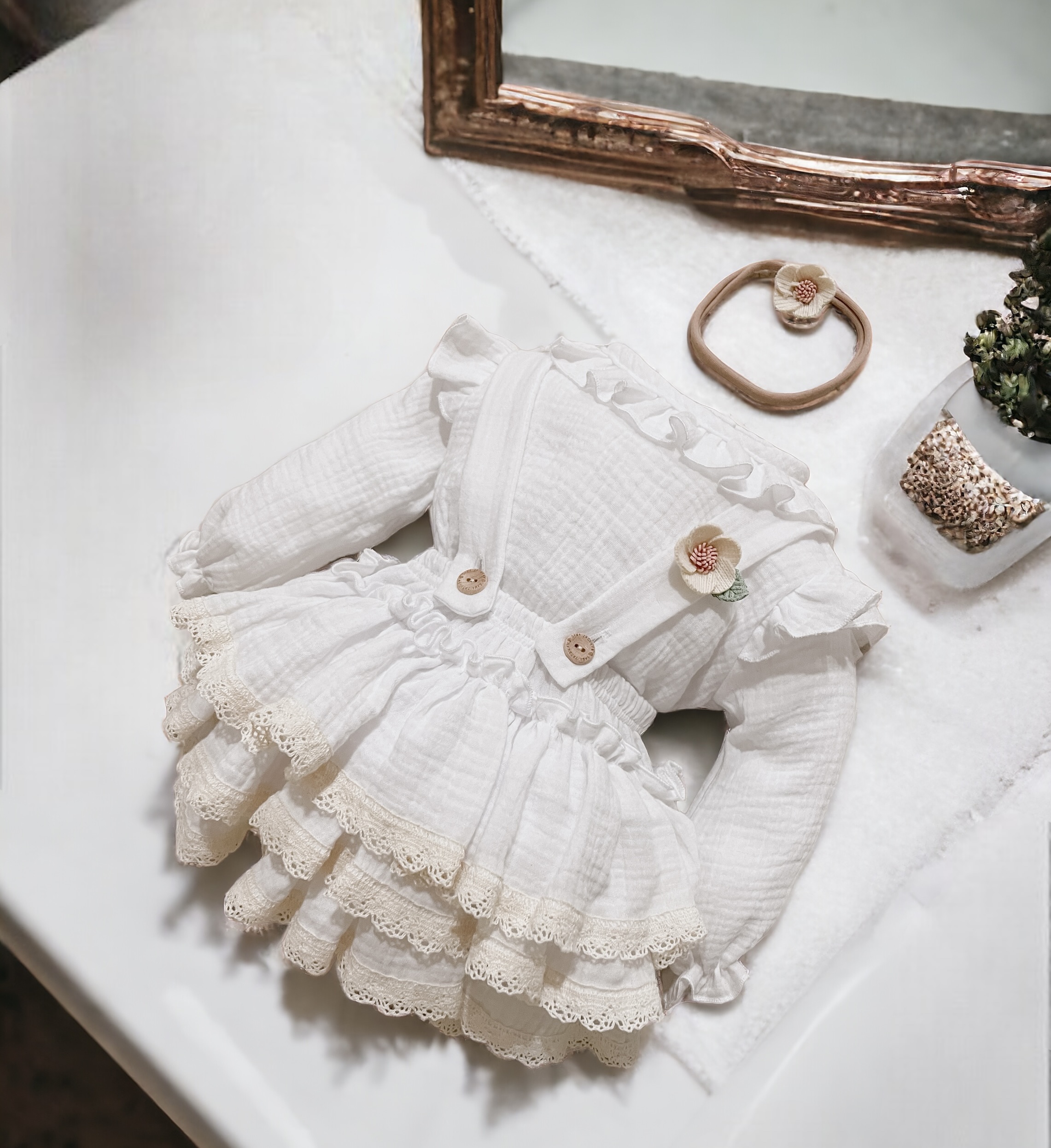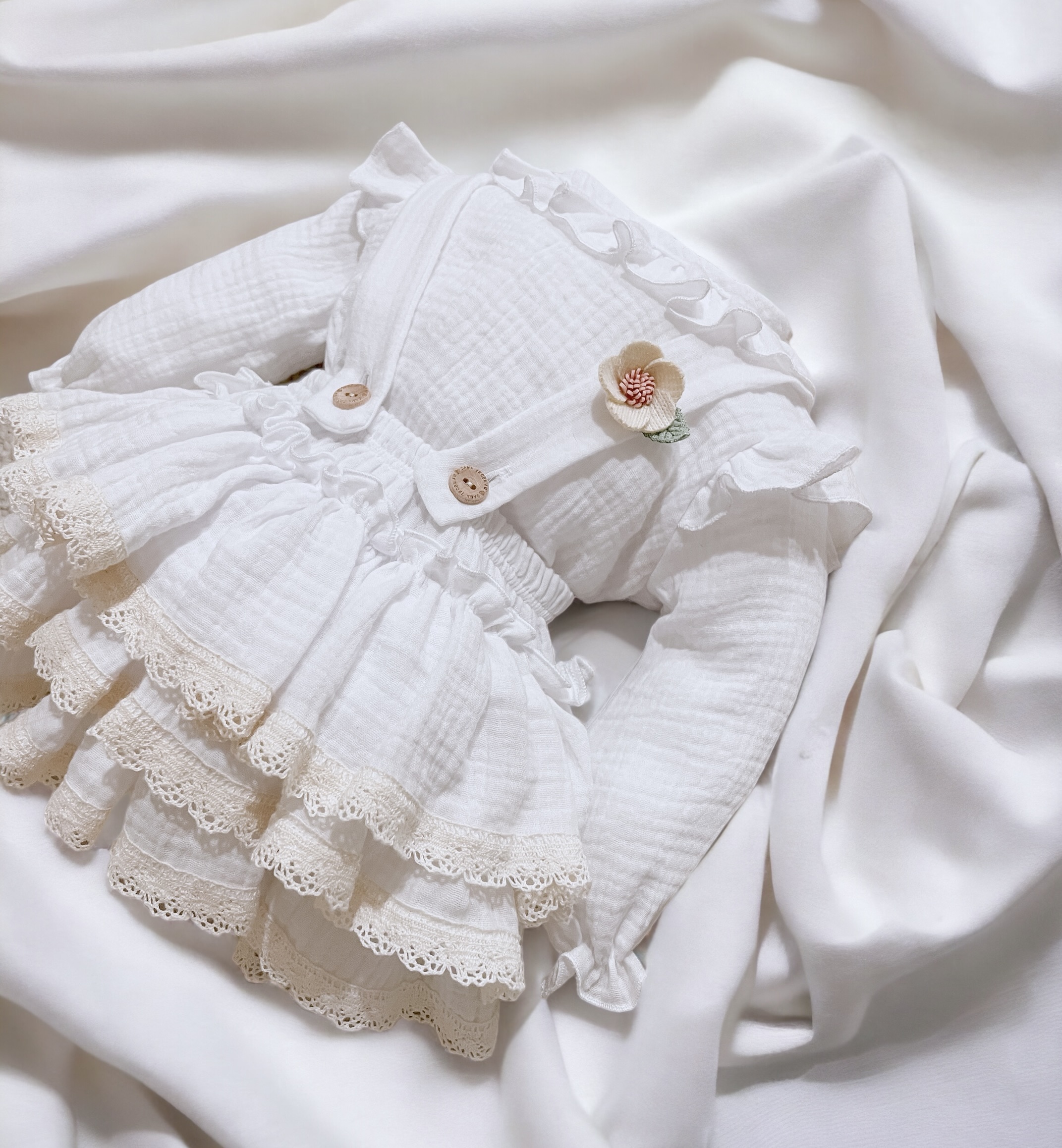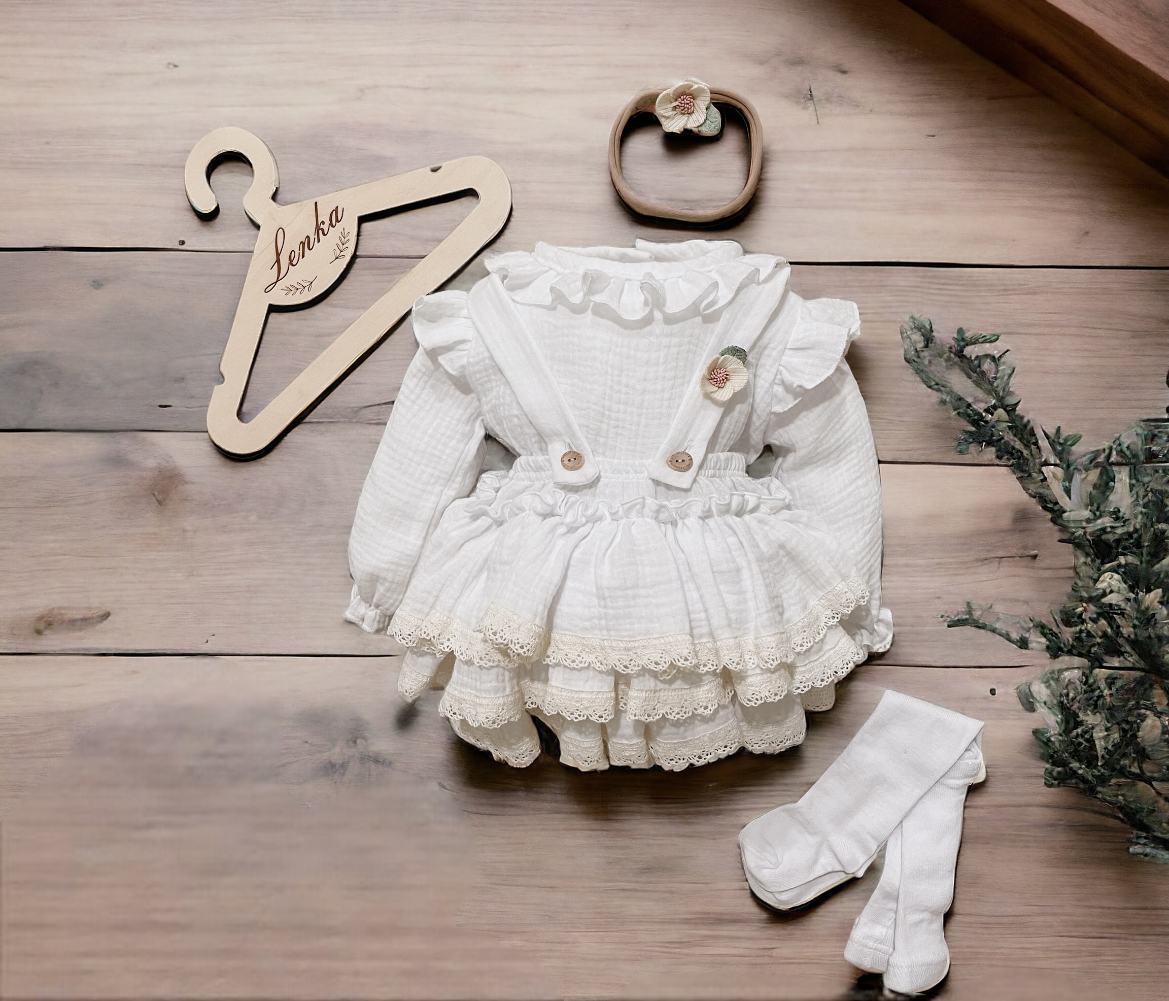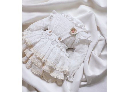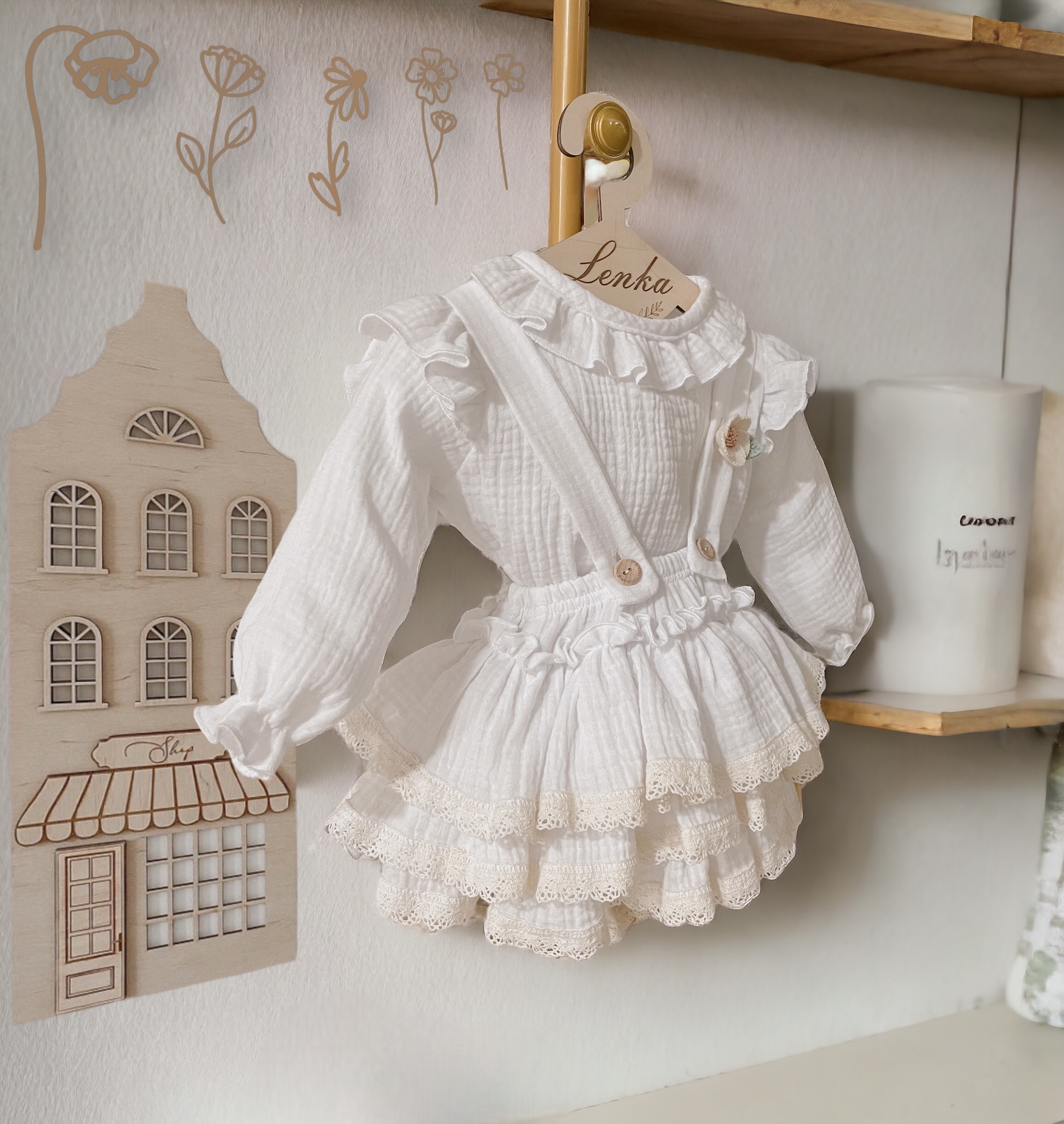 Spódniczka z trzech falban na szelkach uszyta z bawełnianego muślinu, wiązana z tyłu na kokardkę . Produkt posiada wszyte majteczki