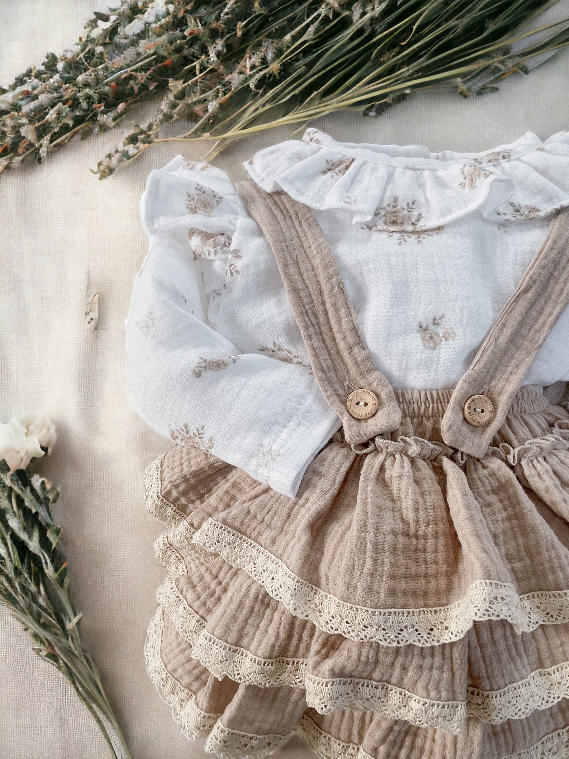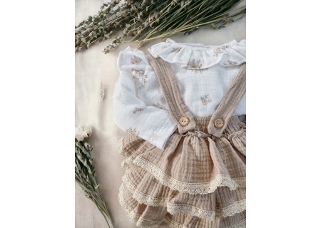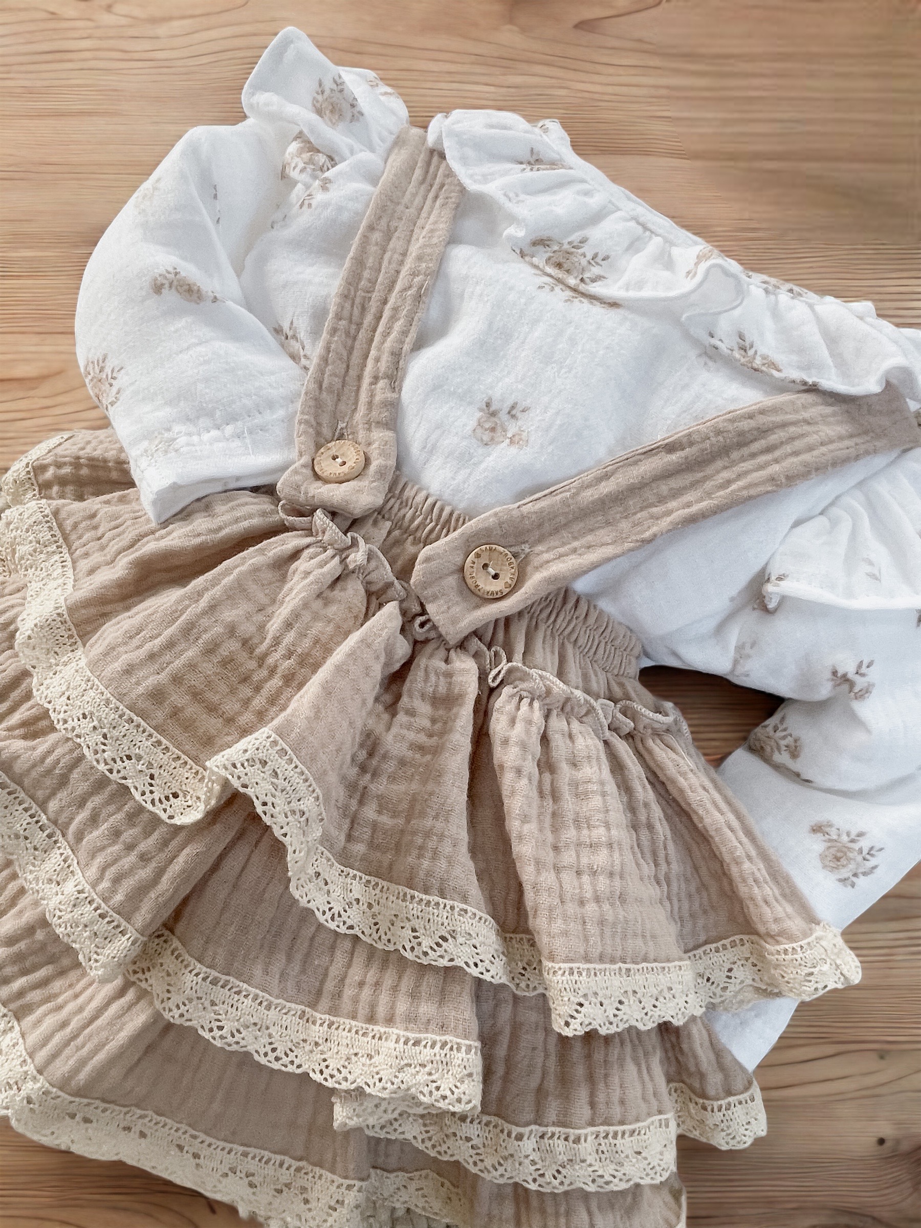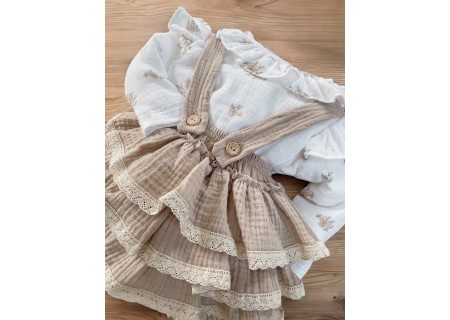 Komplet : Koszula muślinowa Cinamon Roses & spódnica/ bloomersy na szelkach pastelowy beż