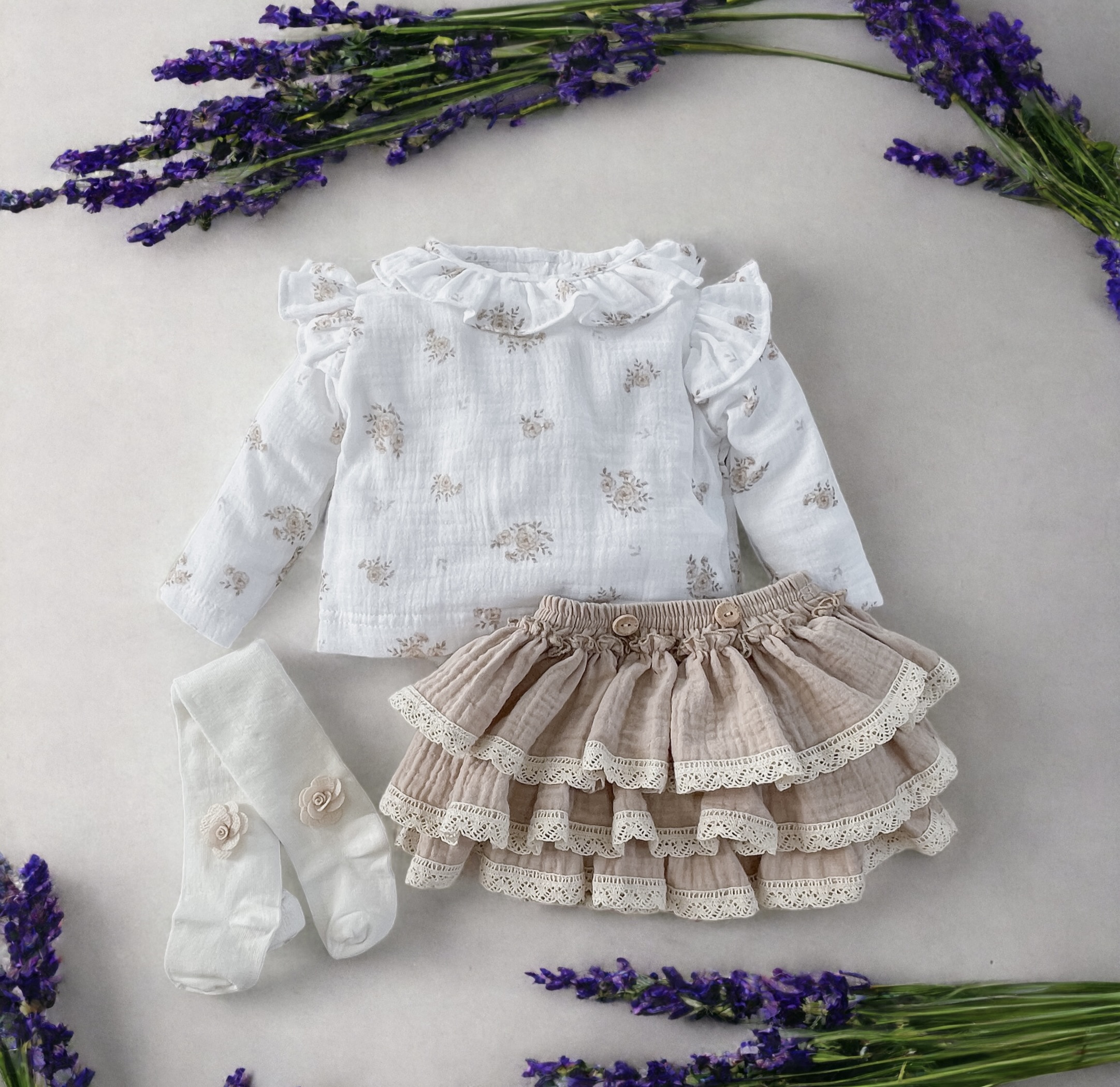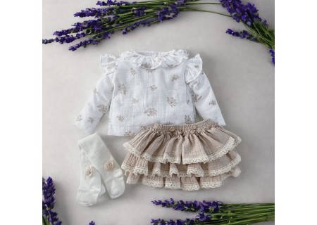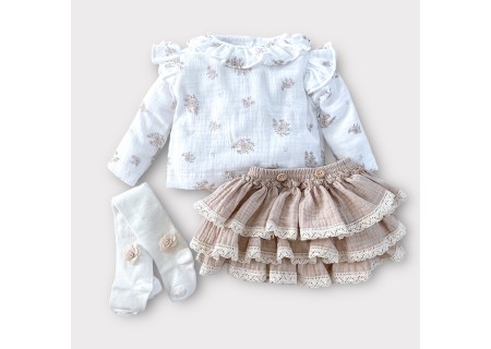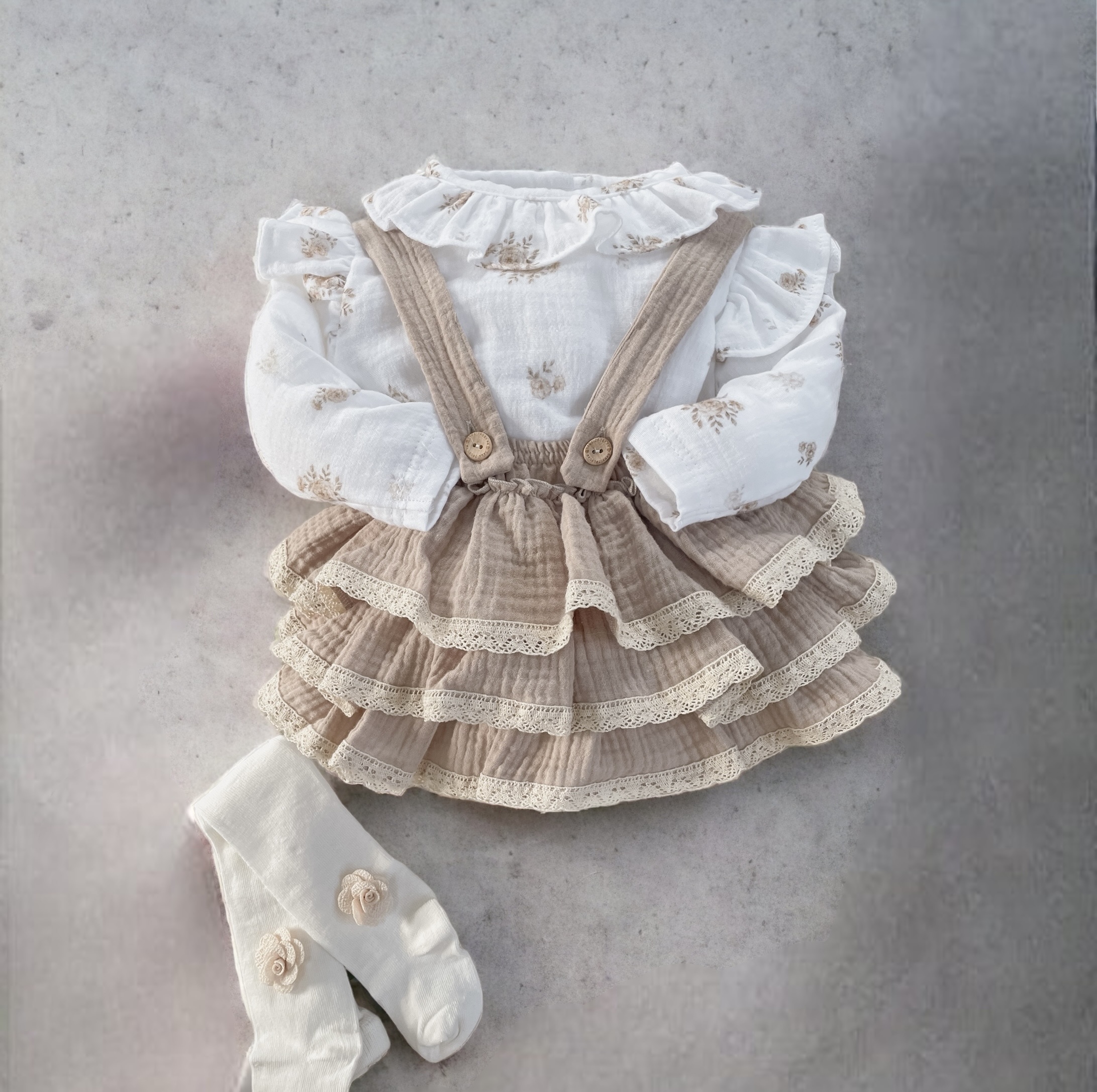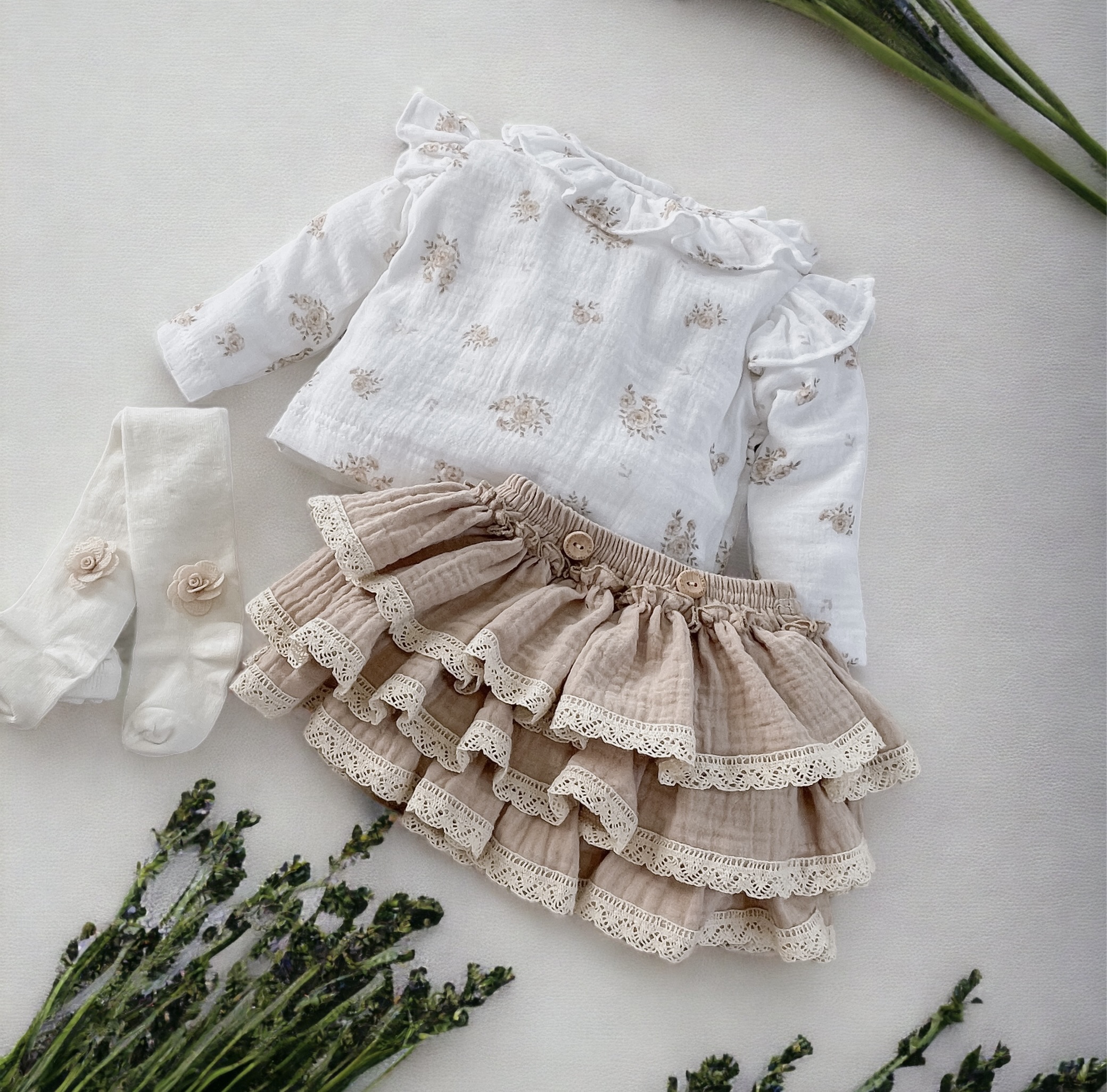 Komplet : Koszula muślinowa Cinamon Roses & spódnica/ bloomersy na szelkach pastelowy beż