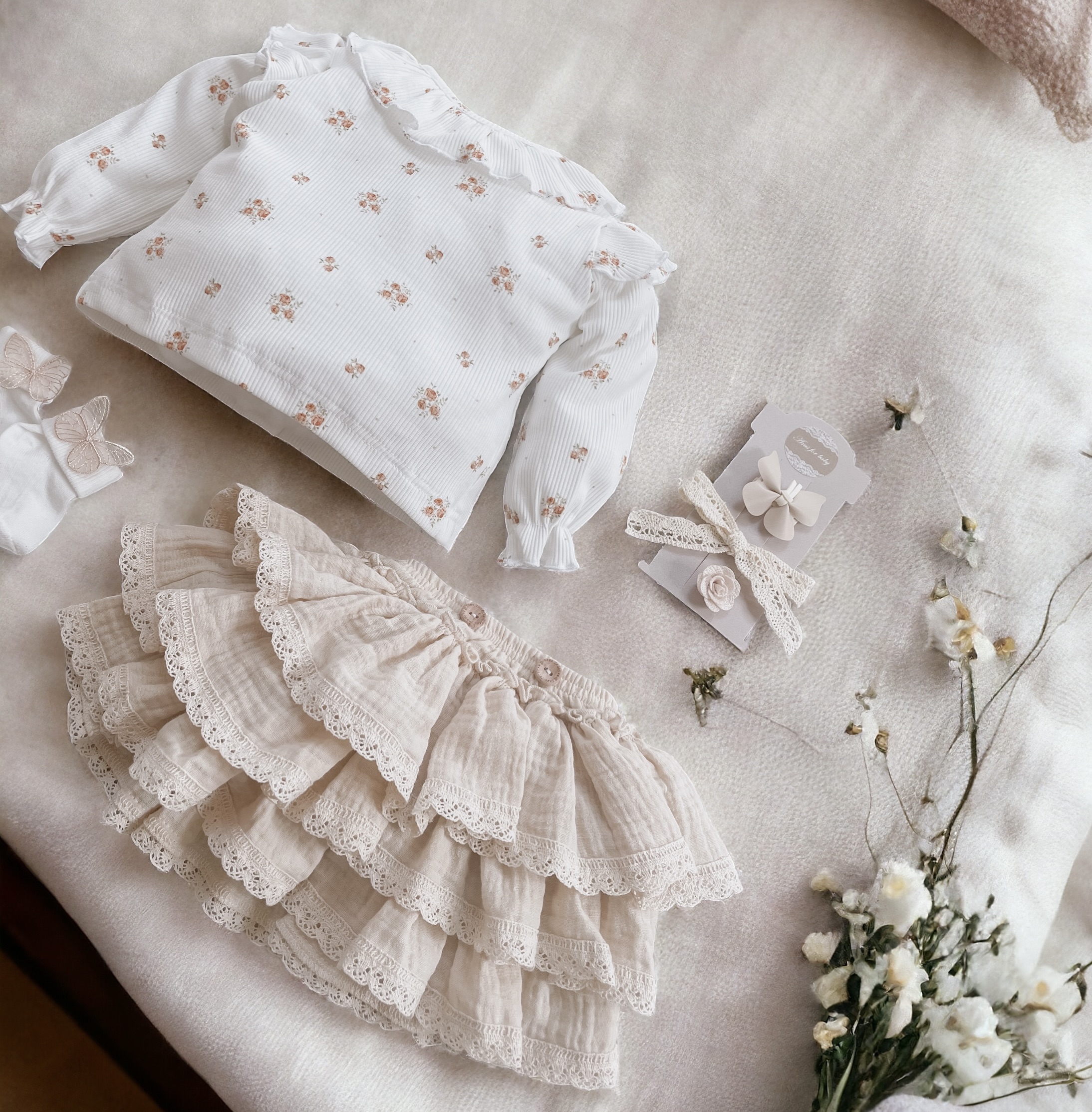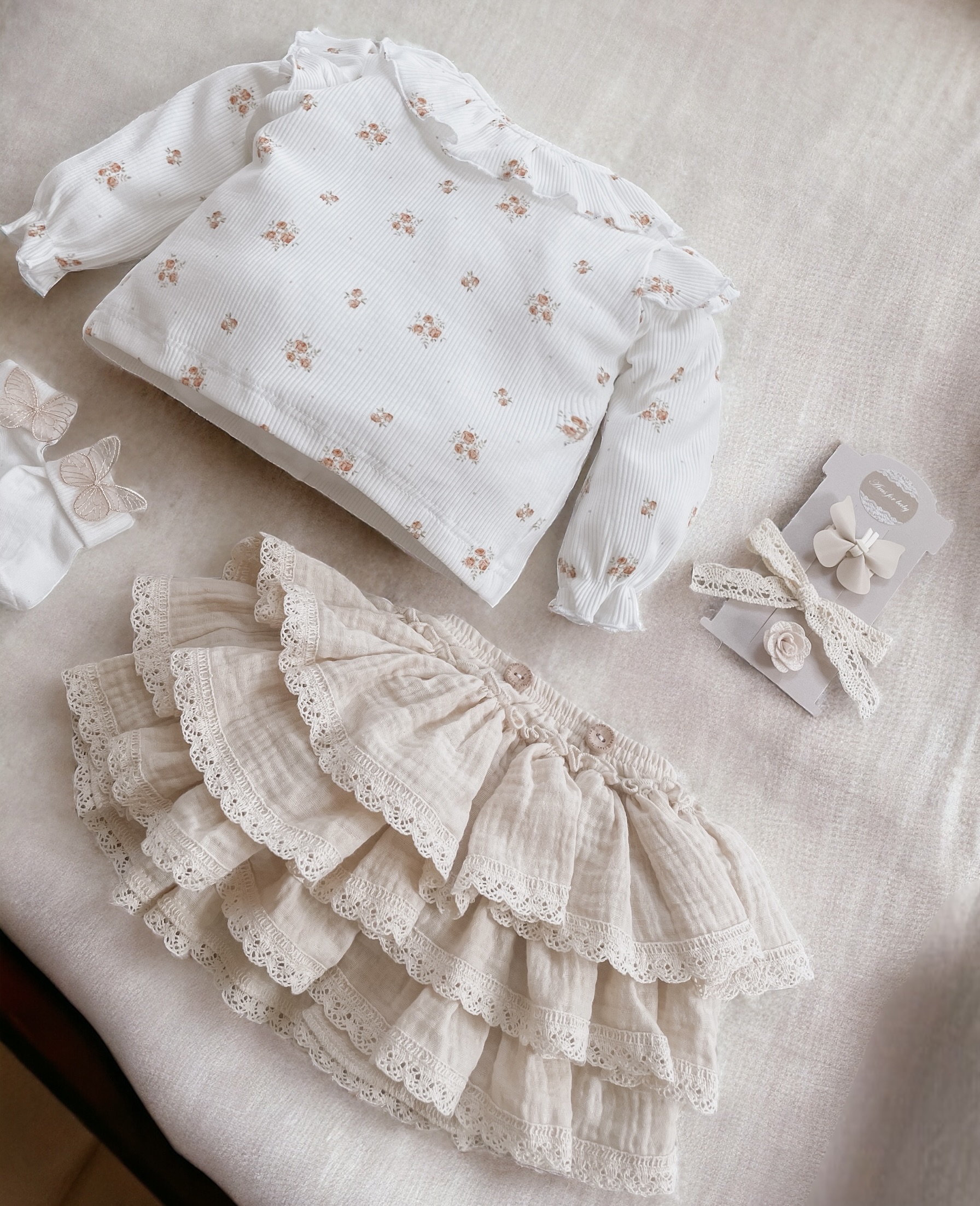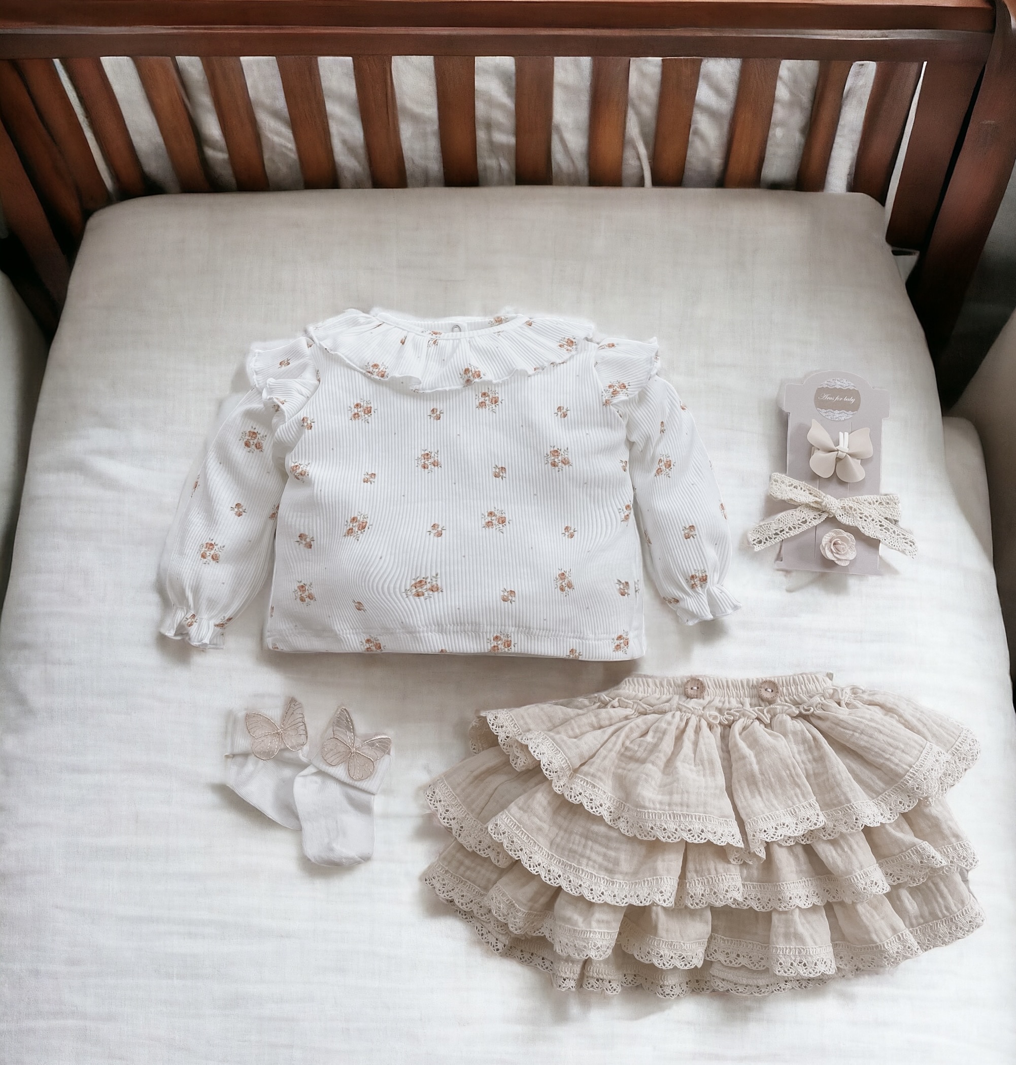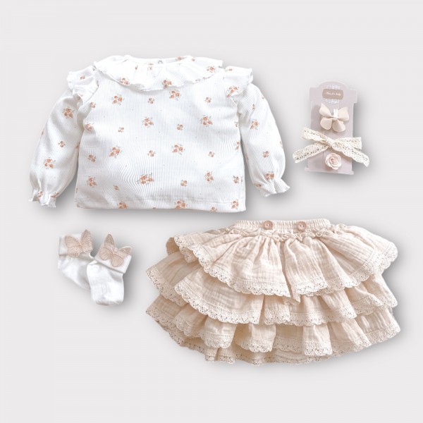 Komplet ubranek : Koszula prążkowana z falbanką Eternal Roses + spódnica/ bloomers na szelkach waniliowy beż + Skarpetki z motylkami + zestaw spinek z opaską bezuciskową