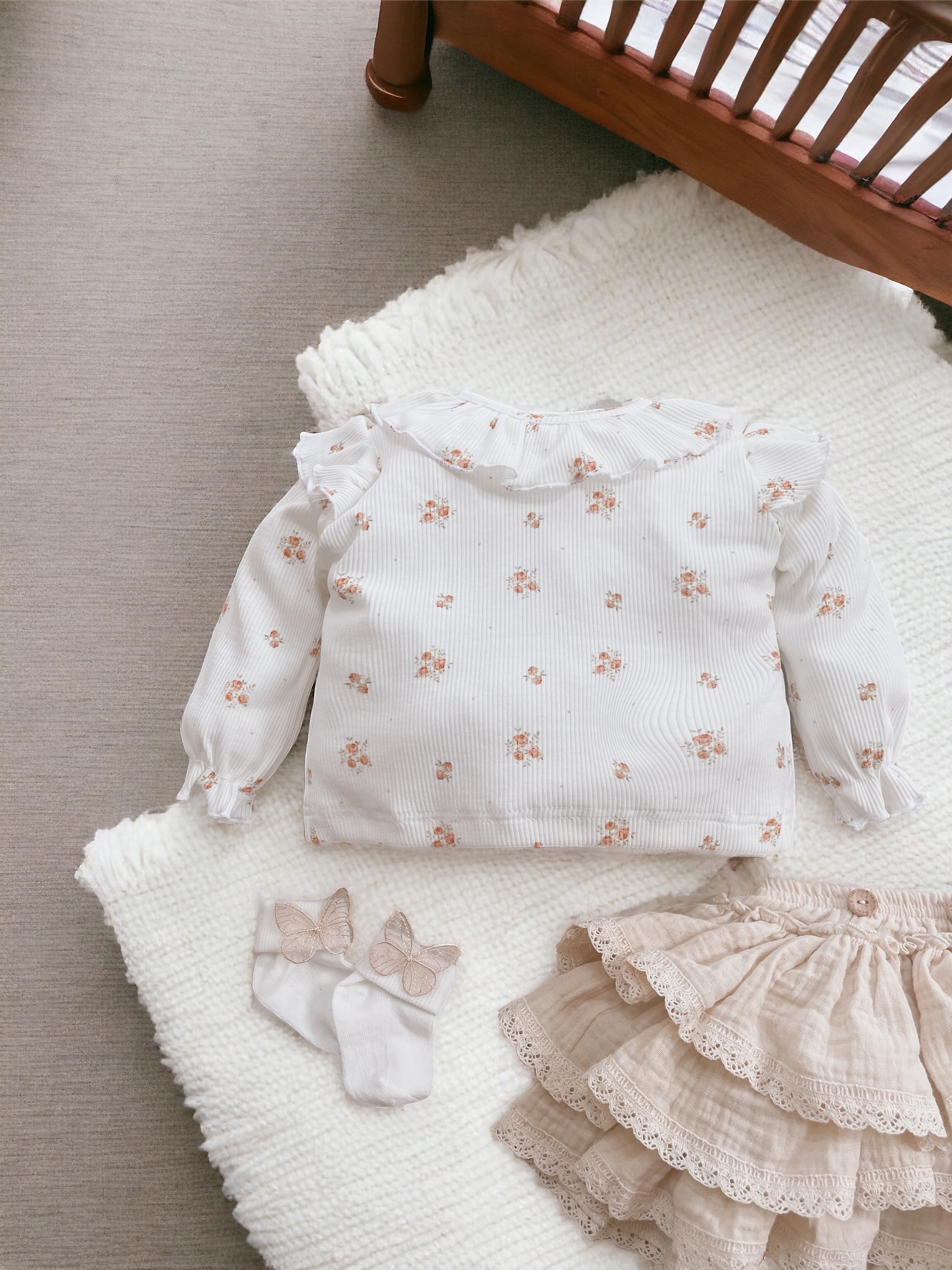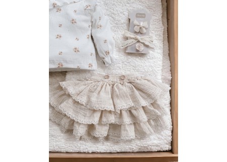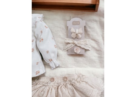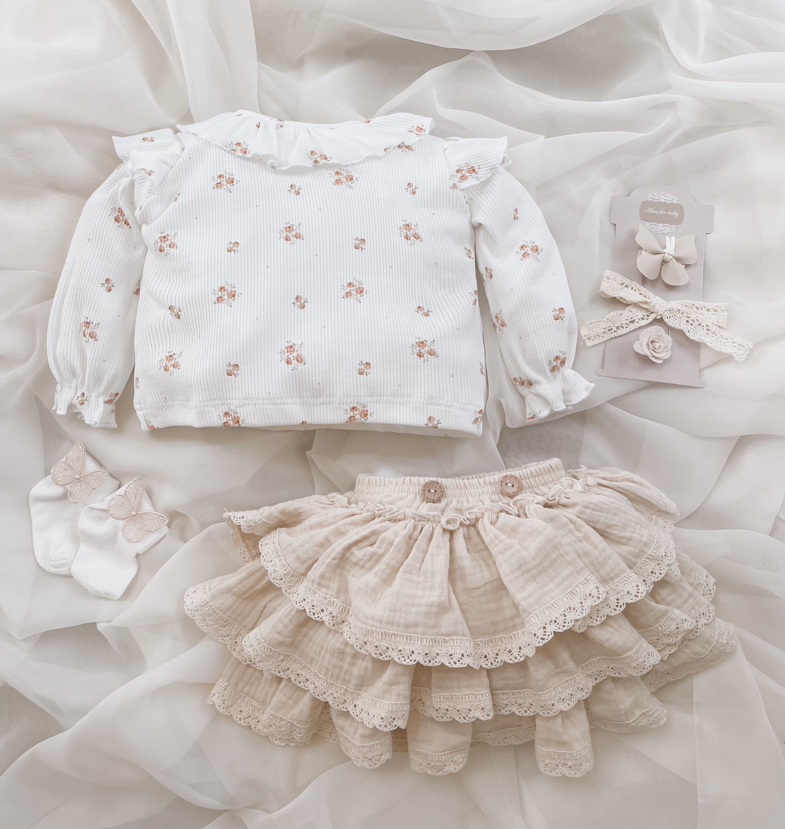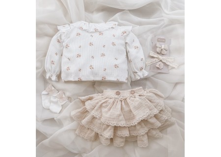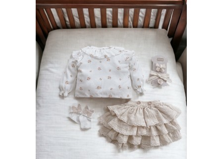 Komplet ubranek : Koszula prążkowana z falbanką Eternal Roses + spódnica/ bloomers na szelkach waniliowy beż + Skarpetki z motylkami + zestaw spinek z opaską bezuciskową