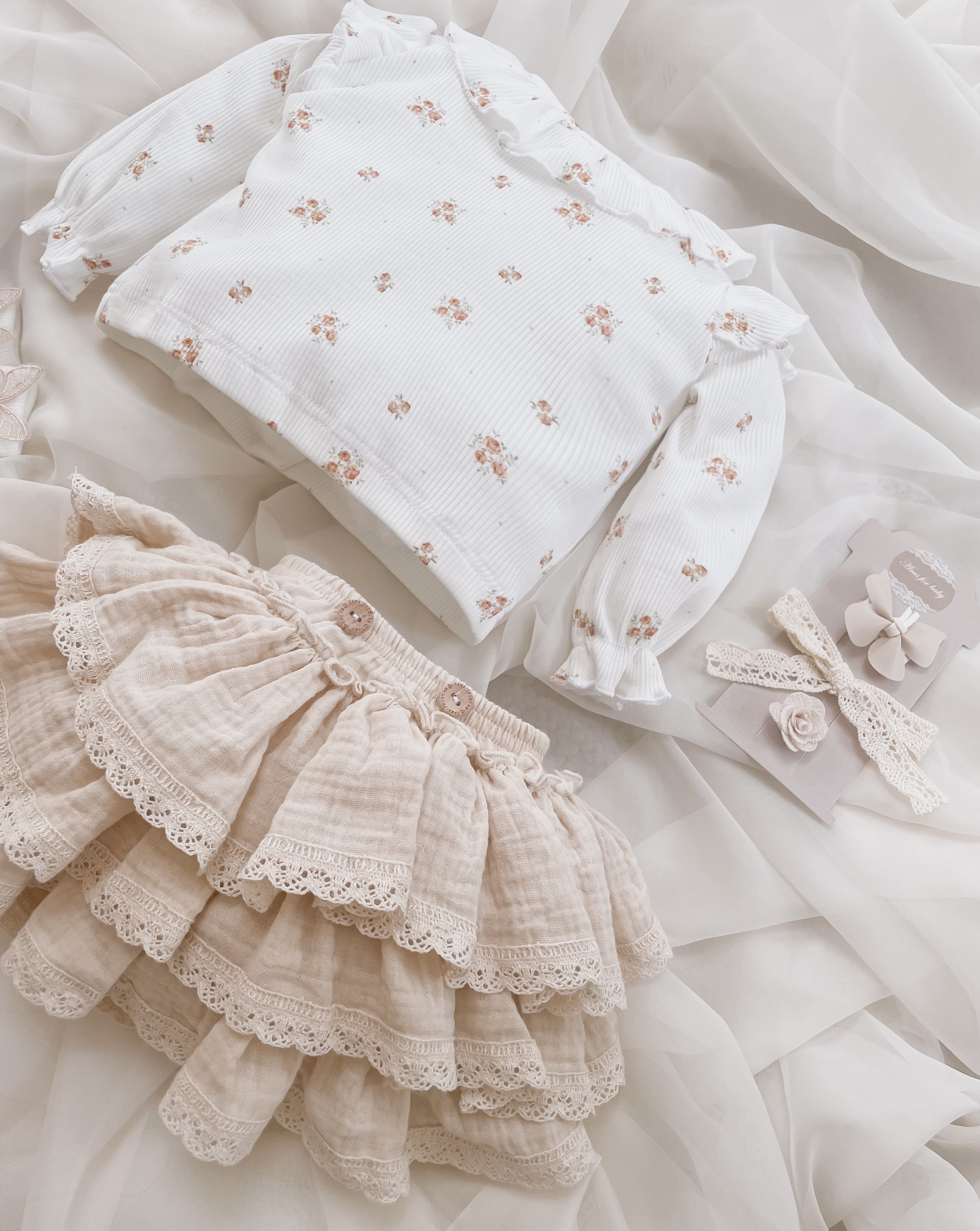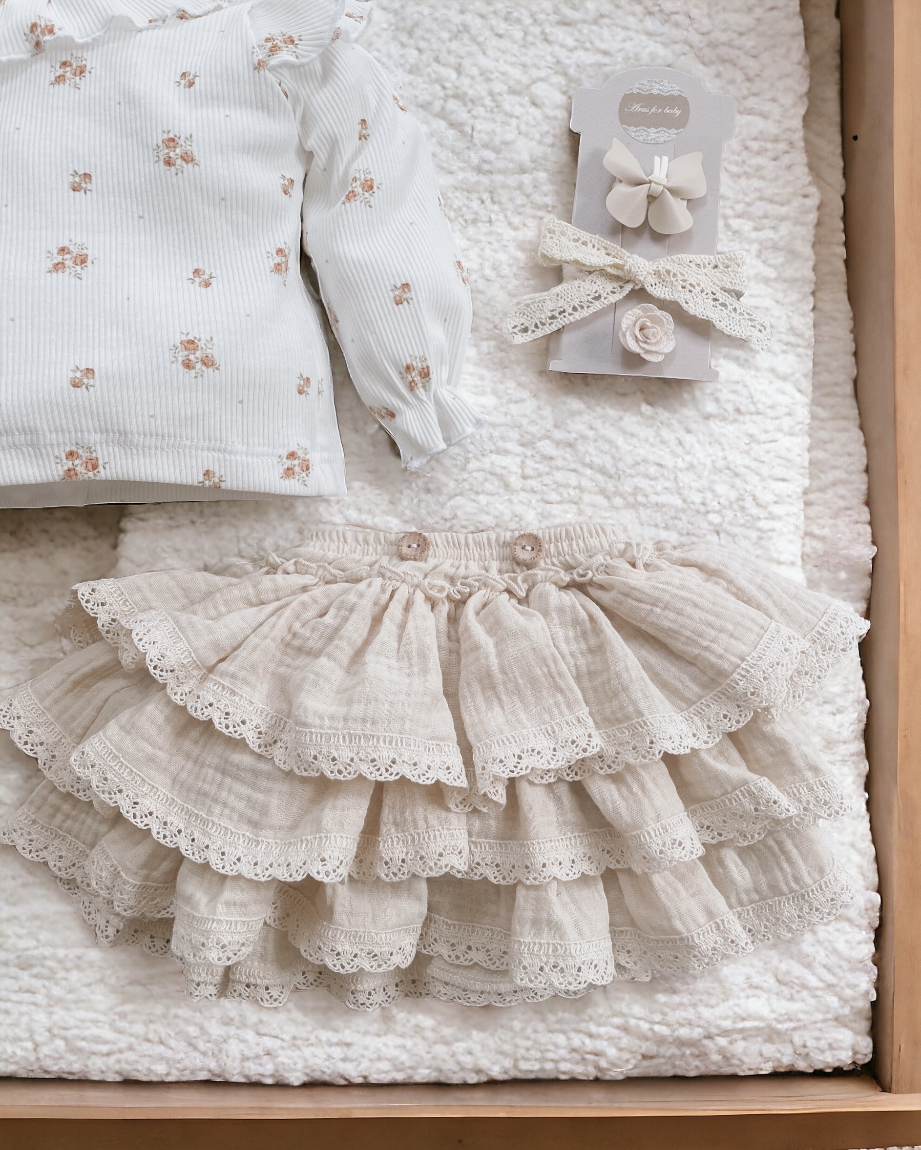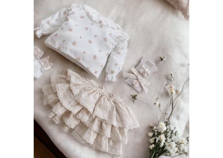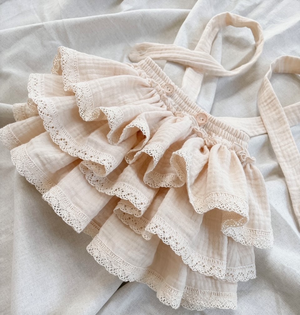 2. SPÓDNICA/ BLOOMERSY NA SZELKACH Z FALBANKAMI I KORONKĄ LOVELY LINE MUŚLINOWA WANILIOWY BEŻ
