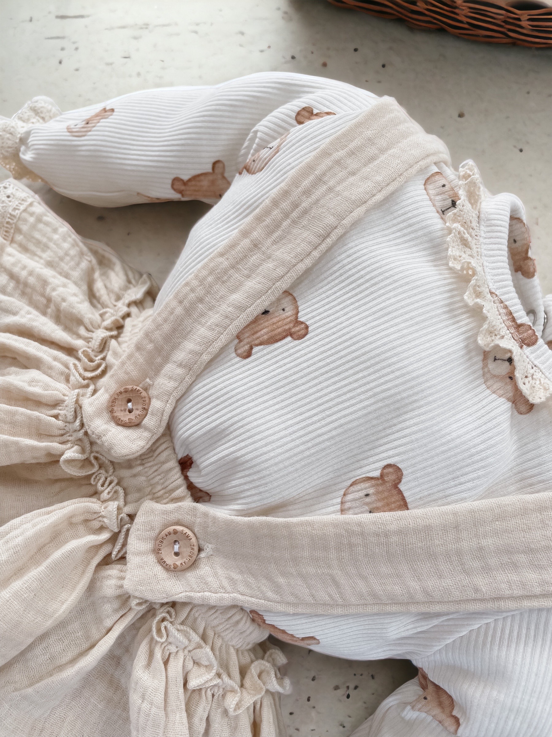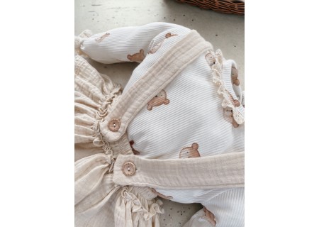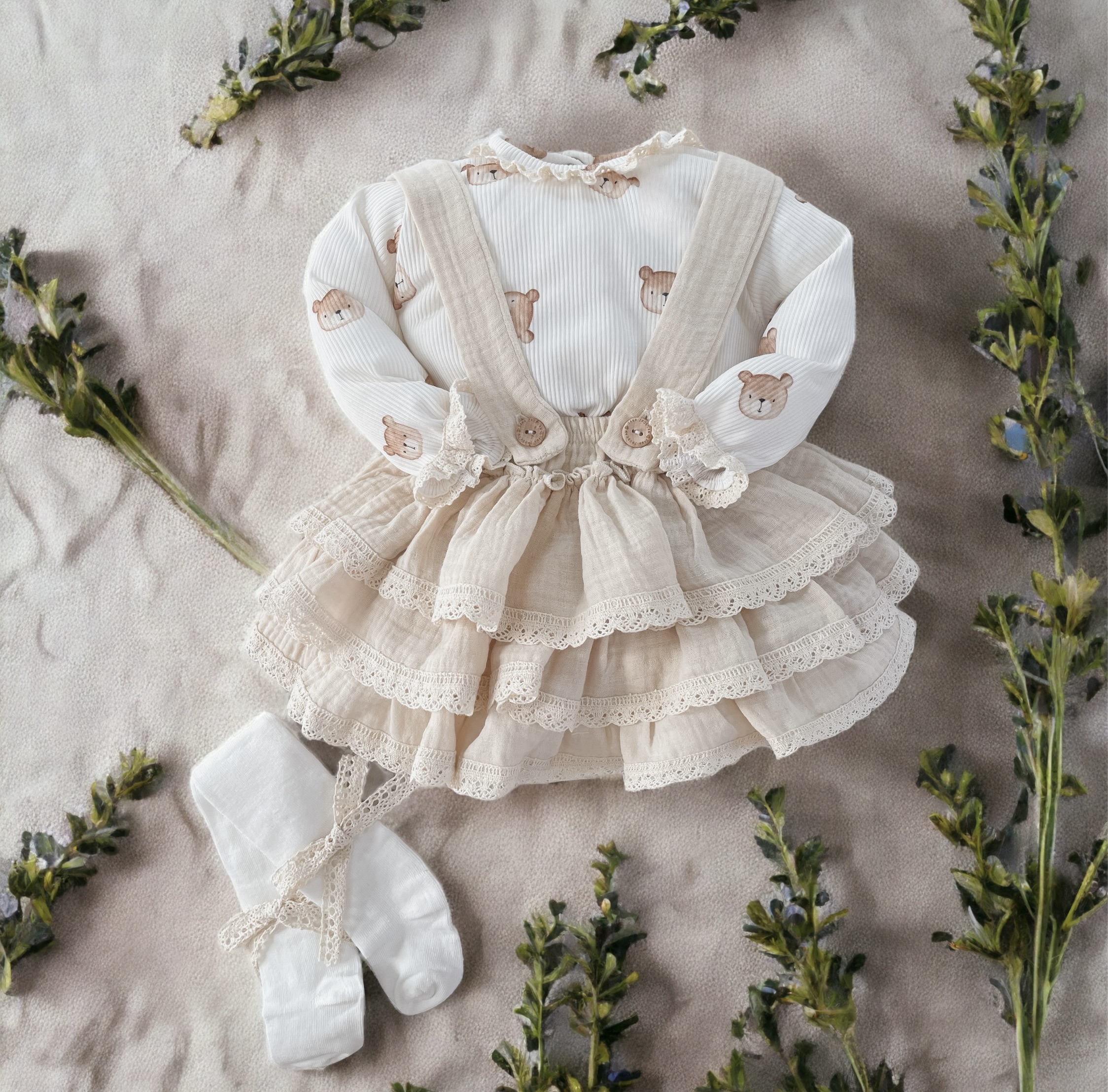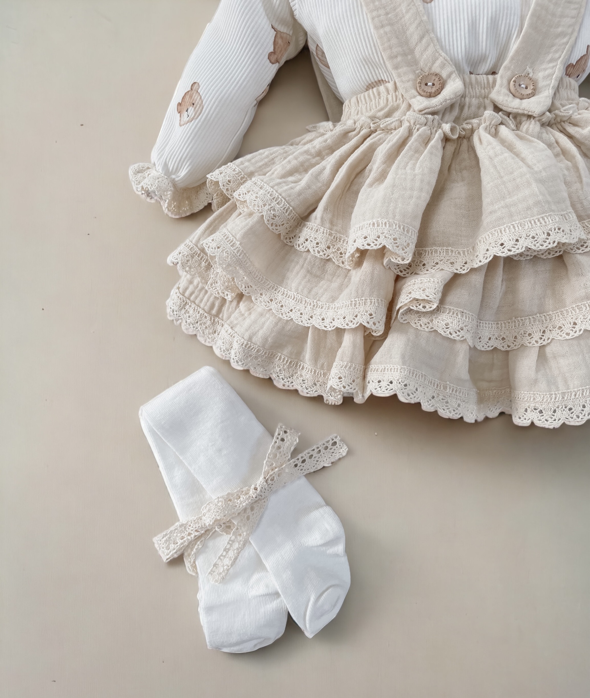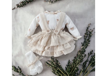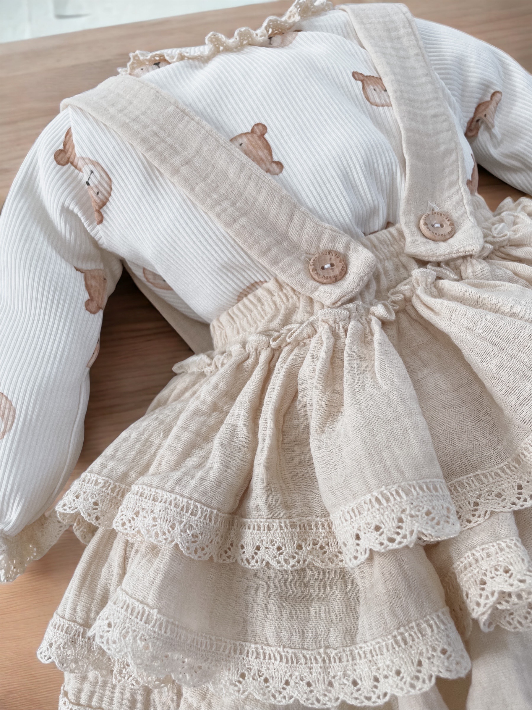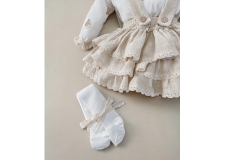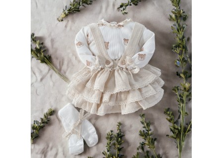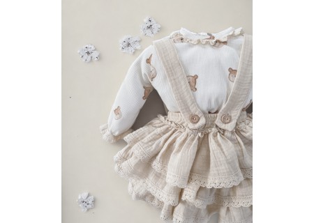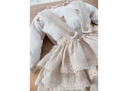 Komplet ubranek : Koszula prążkowana z koronką Little Teddy + spódnica/ bloomers na szelkach waniliowy beż