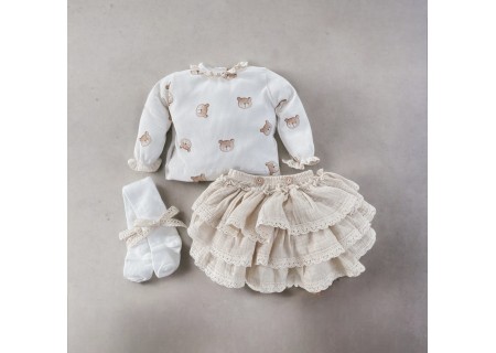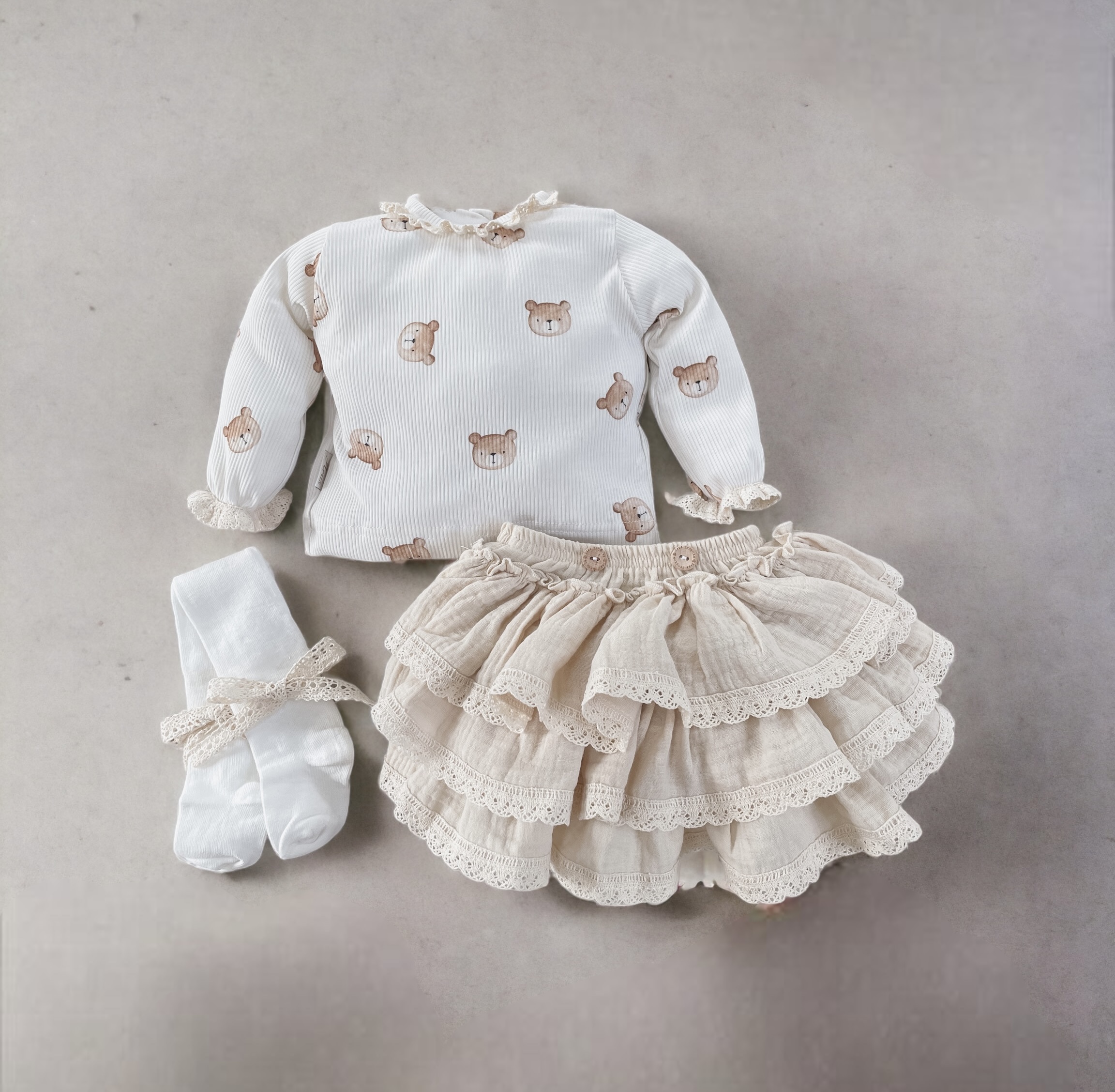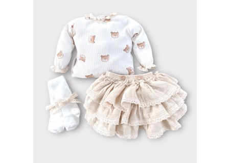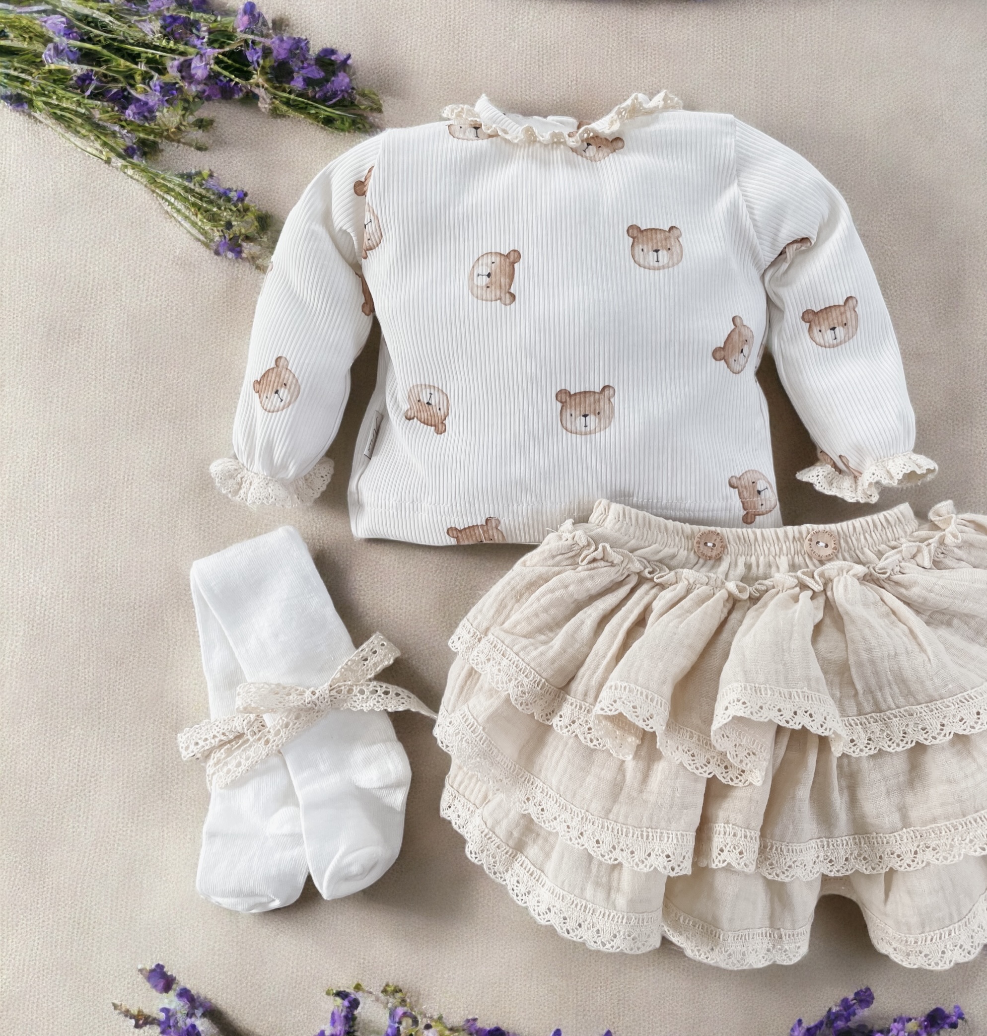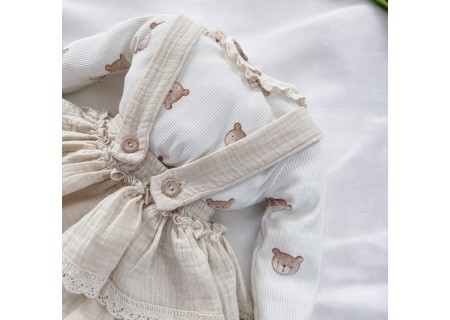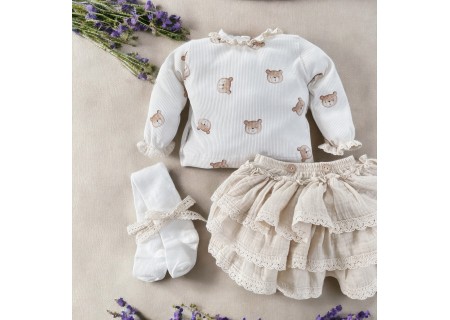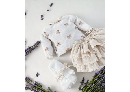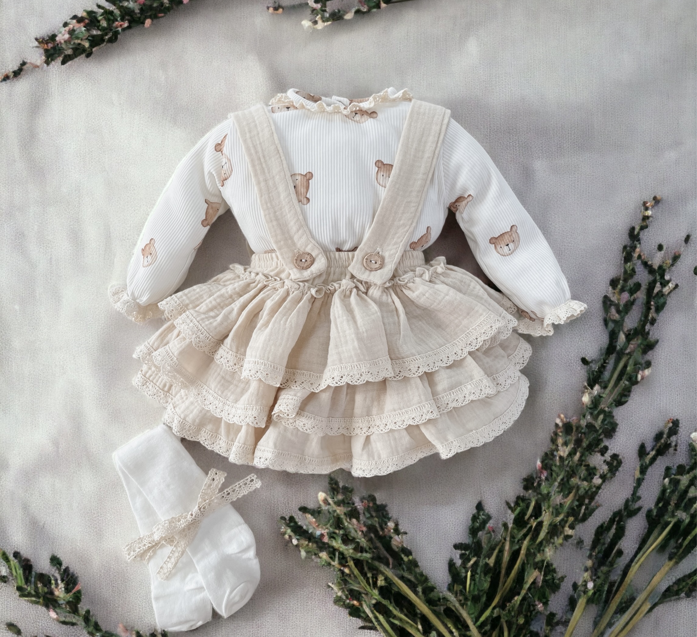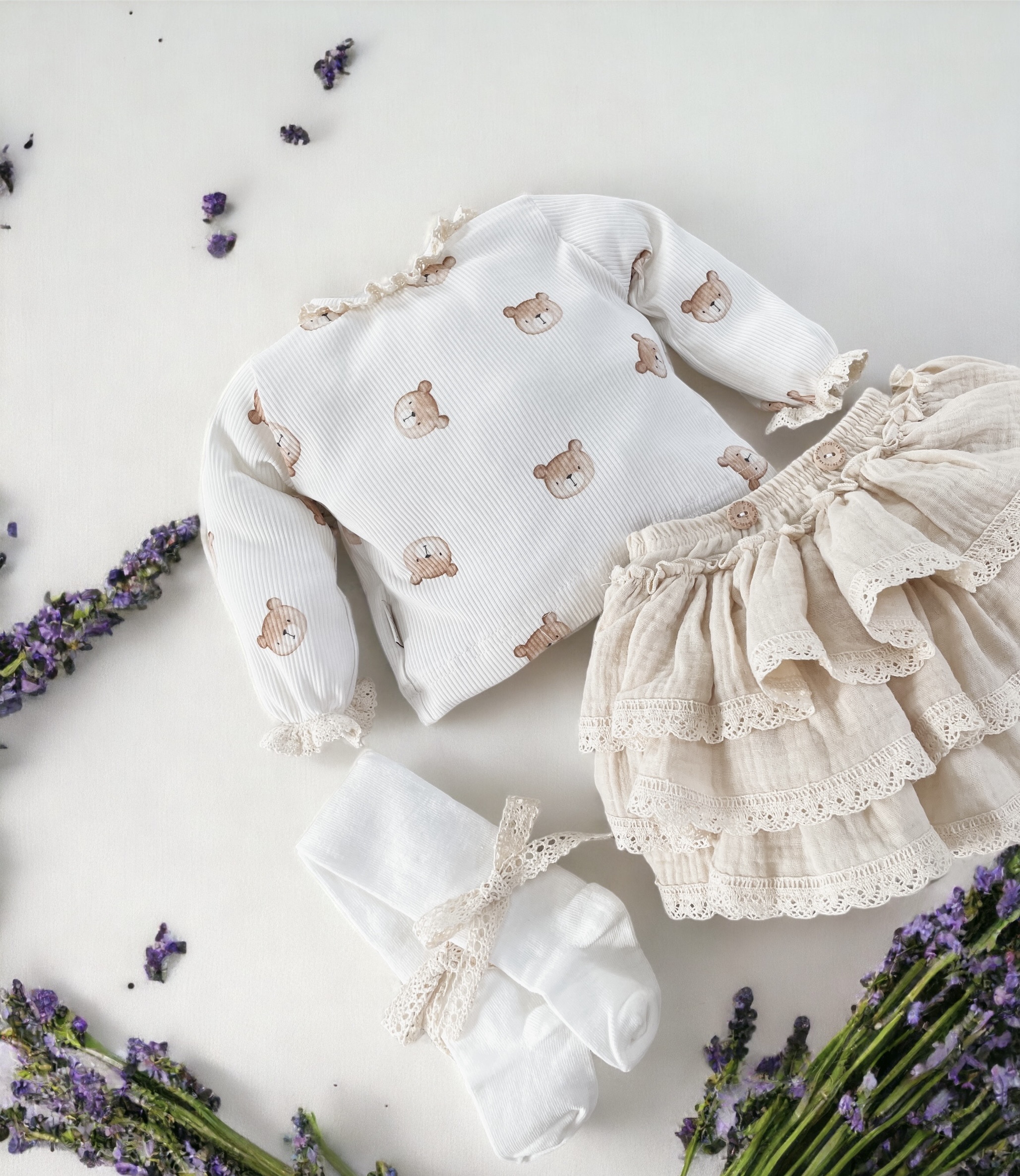 Komplet ubranek : Koszula prążkowana z koronką Little Teddy + spódnica/ bloomers na szelkach waniliowy beż