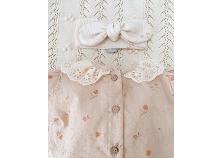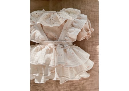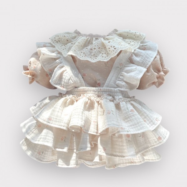 1. Spódniczka z trzech falban na szelkach uszyta z bawełnianego muślinu, wiązana z tyłu na kokardkę . Produkt posiada wszyte majteczki.