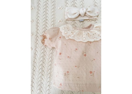 2. Bawełniana koszula ozdobiona falbanką z rękawkami typu bufki, uszyta ze 100% bawełny typu plumetti , z tyłu zapinana na drewniane guziczki. Tkanina w swojej fakturze posiada delikatne haftowane kropeczki. Niezwykle miękka w dotyku i komfortowa w noszeniu. Koszula ozdobiona haftowanym, beżowym kołnierzykiem.
