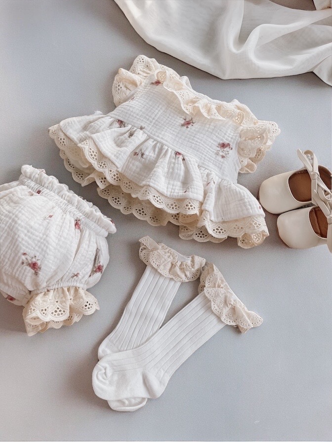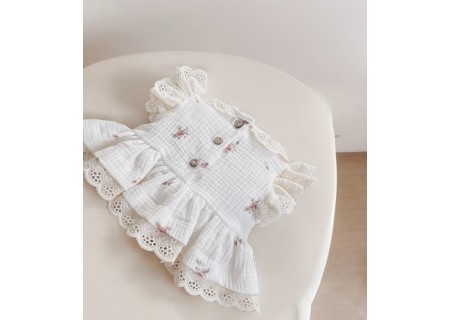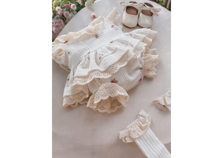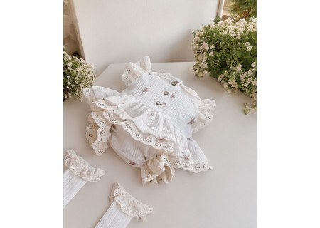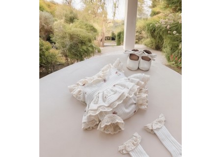 Kołnierzyk oraz rękawy zostały wykończone beżową, haftowaną falbanką.