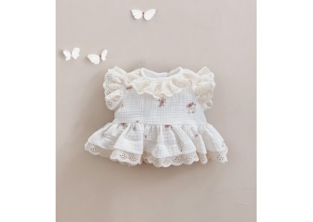 Bluzeczka wykonana ze stu procentowego muślinu bawełnianego. Idealna na lato, przewiewna, zwiewna i delikatna w swojej strukturze. Top zapinany na drewniane guziczki i ozdobiony falbanką, zakończoną beżową haftką w stylu romantycznym.