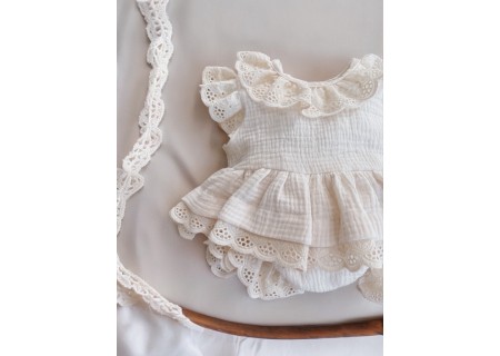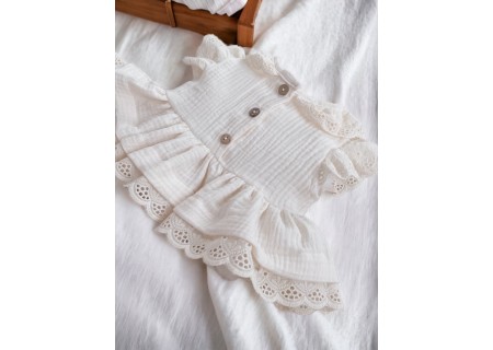 Bluzeczka wykonana ze stu procentowego muślinu bawełnianego. Idealna na lato, przewiewna, zwiewna i delikatna w swojej strukturze. Top zapinany na drewniane guziczki i ozdobiony falbanką, zakończoną beżową haftką w stylu romantycznym.