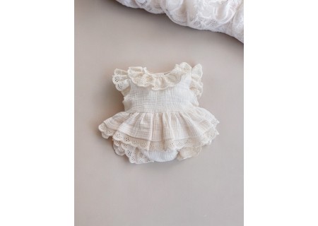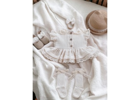 Kołnierzyk oraz rękawy zostały wykończone beżową, haftowaną falbanką.