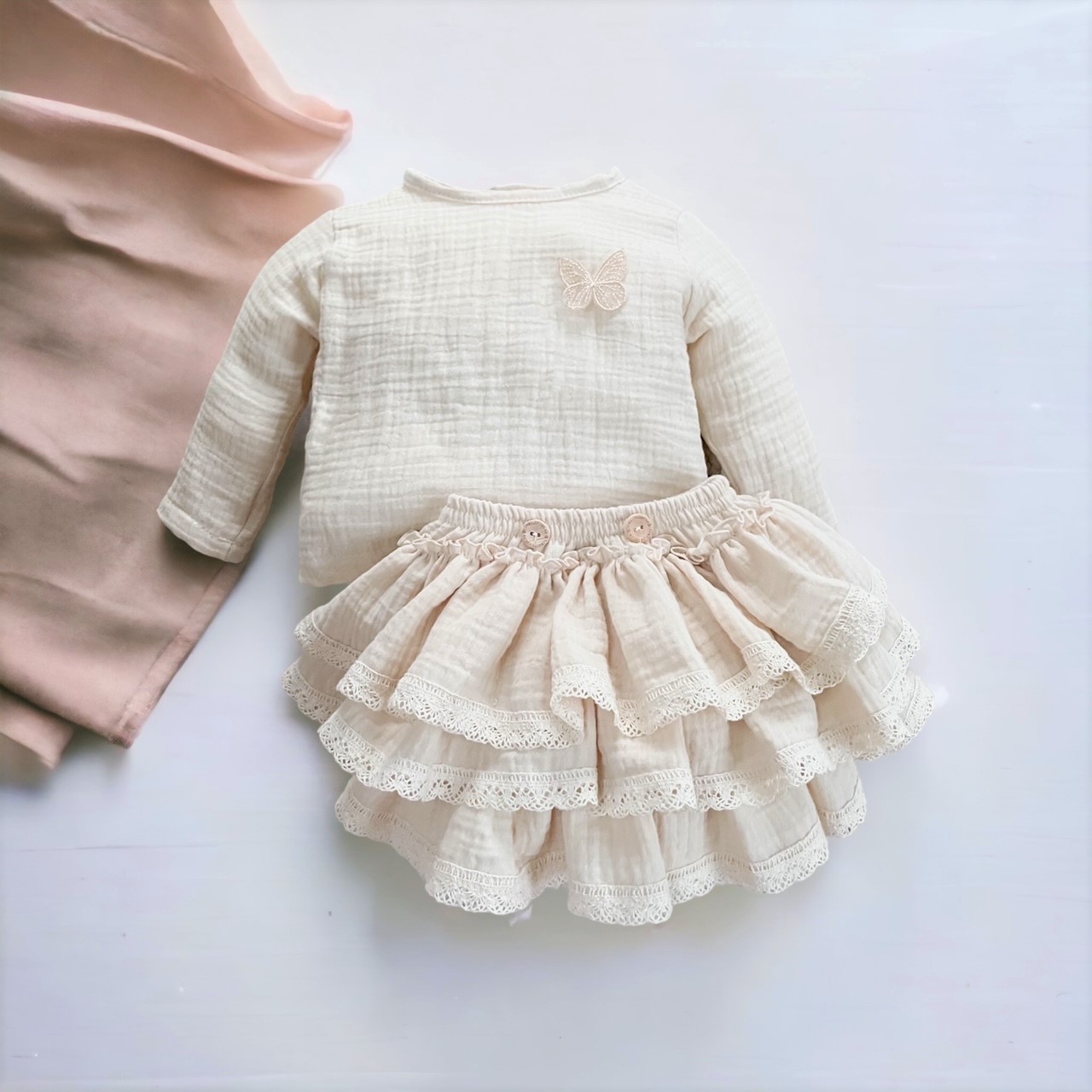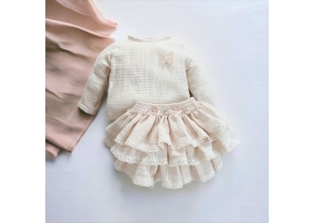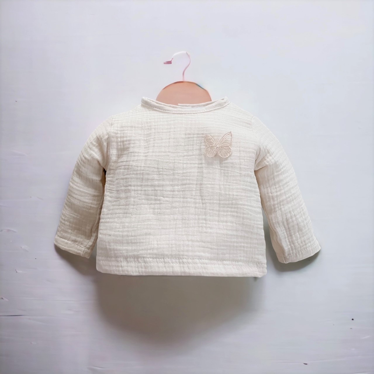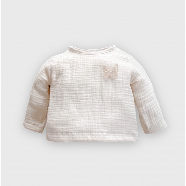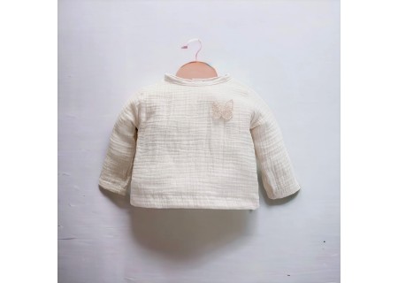 Muślinowa koszula z kolekcji Butterfly of the Valley ozdobiona motylkiem, uszyta ze 100% muślinu bawełnianego , z tyłu zapinana na drewniane guziczki. Niezwykle miękka w dotyku i komfortowa w noszeniu.