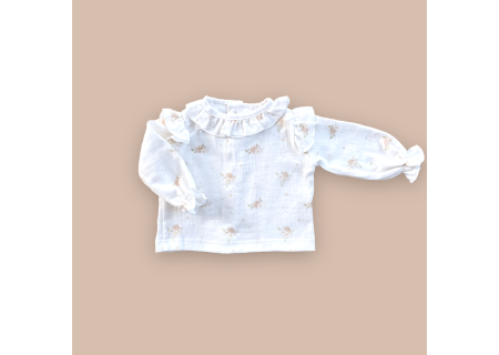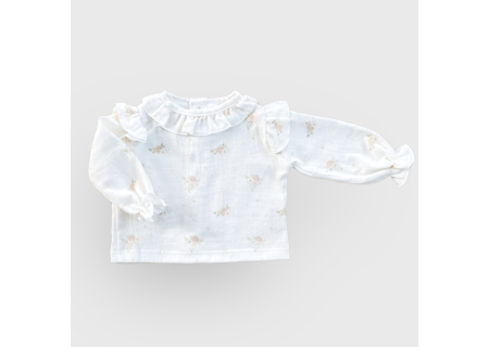Muślinowa koszula ozdobiona falbankami z nowej kolekcji, uszyta ze 100% muślinu bawełnianego , z tyłu zapinana na drewniane guziczki. Niezwykle miękka w dotyku i komfortowa w noszeniu.