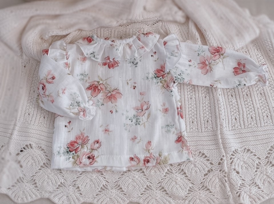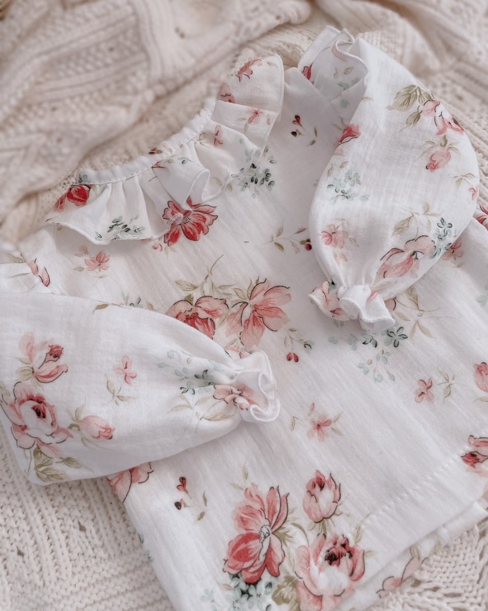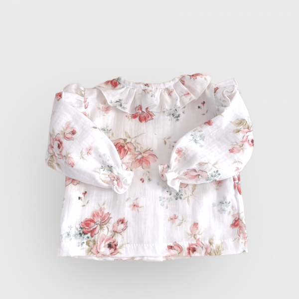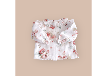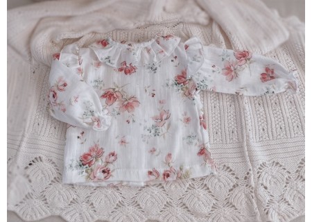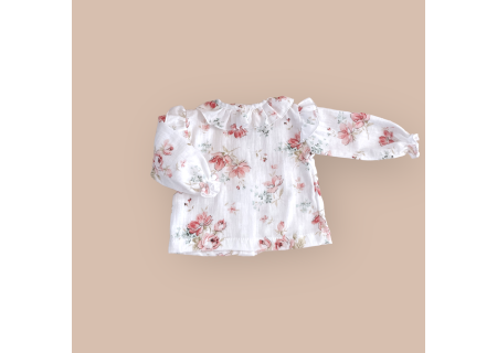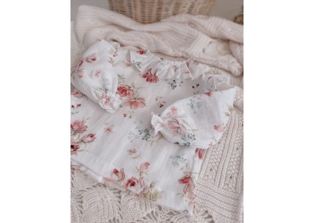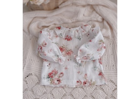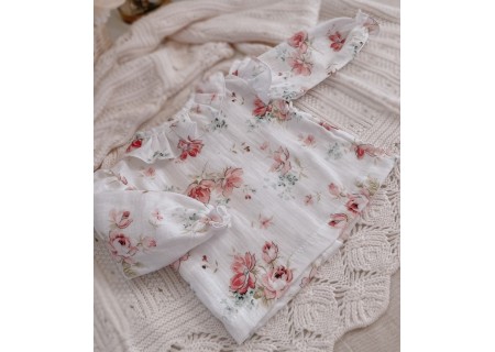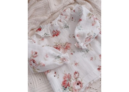 Muślinowa koszula ozdobiona falbankami z nowej kolekcji, uszyta ze 100% muślinu bawełnianego , z tyłu zapinana na drewniane guziczki. Niezwykle miękka w dotyku i komfortowa w noszeniu.