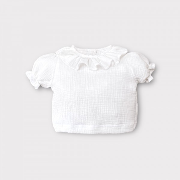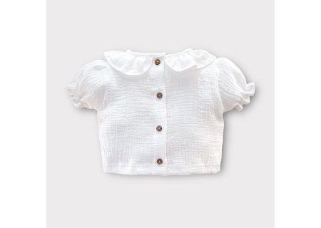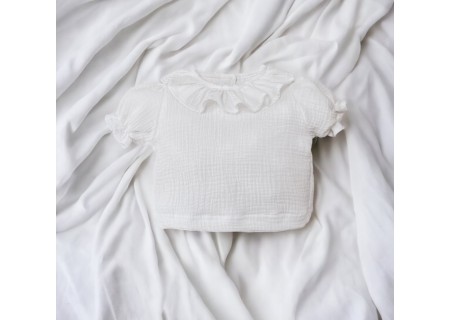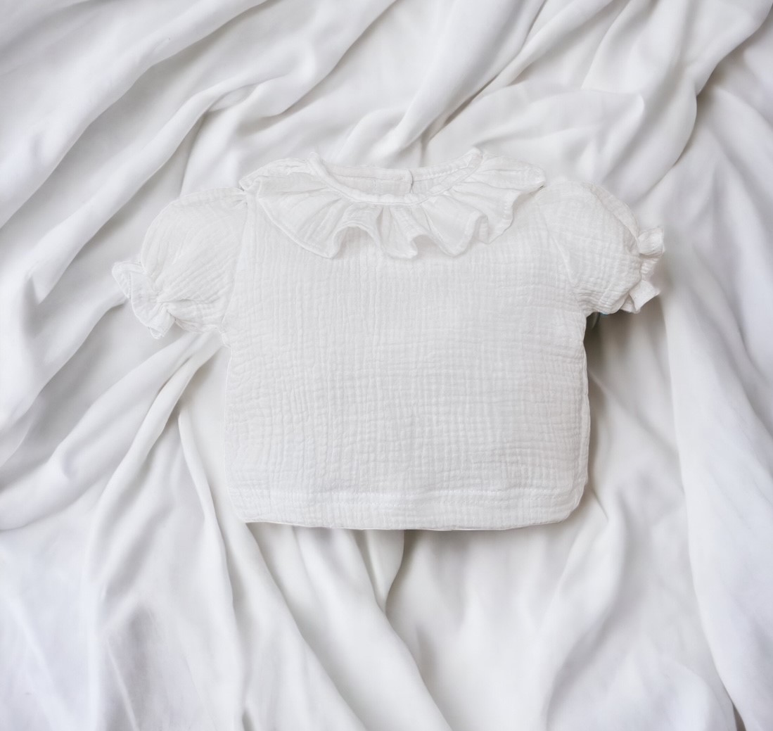 Muślinowa koszula ozdobiona  falbanką z rękawkami typu bufki, uszyta ze 100% muślinu bawełnianego , z tyłu zapinana na drewniane guziczki. Niezwykle miękka w dotyku i komfortowa w noszeniu.