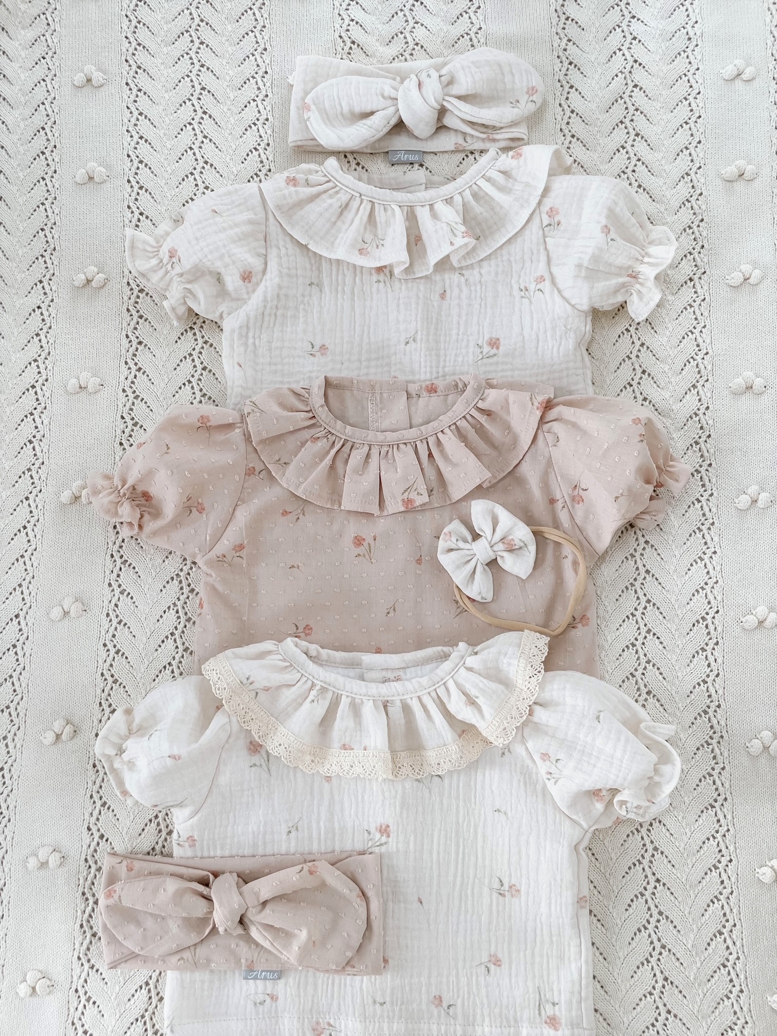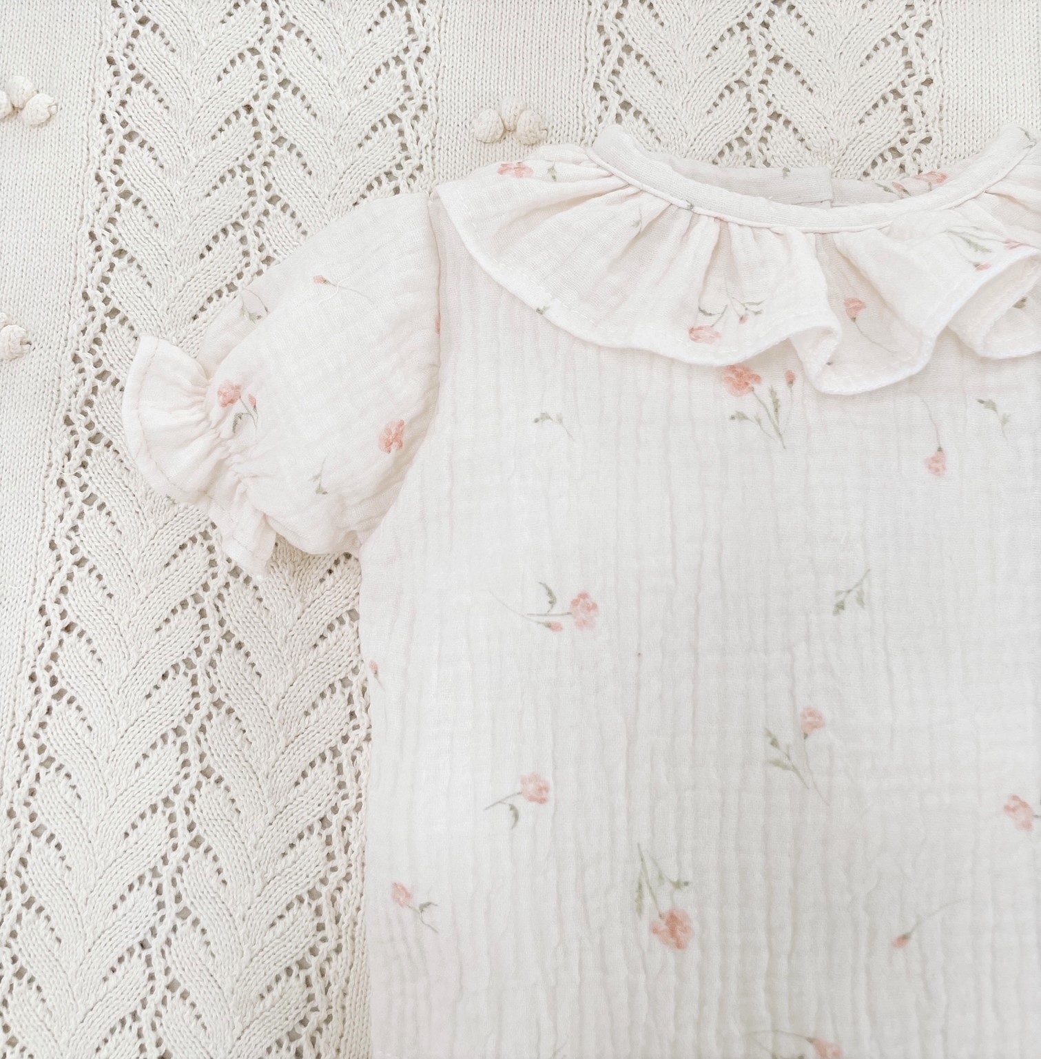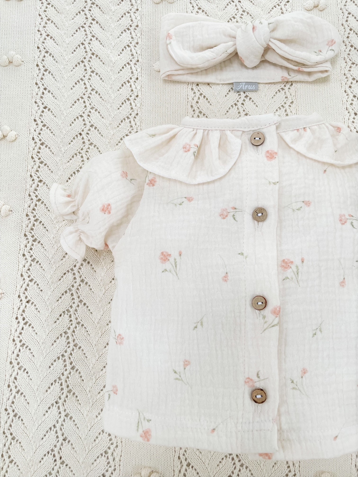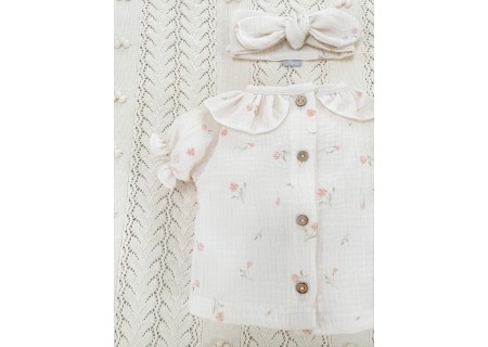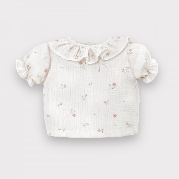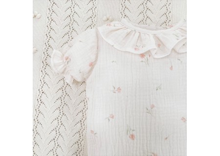 Muślinowa koszula ozdobiona falbanką z rękawkami typu bufki, uszyta ze 100% muślinu bawełnianego , z tyłu zapinana na drewniane guziczki. Niezwykle miękka w dotyku i komfortowa w noszeniu.