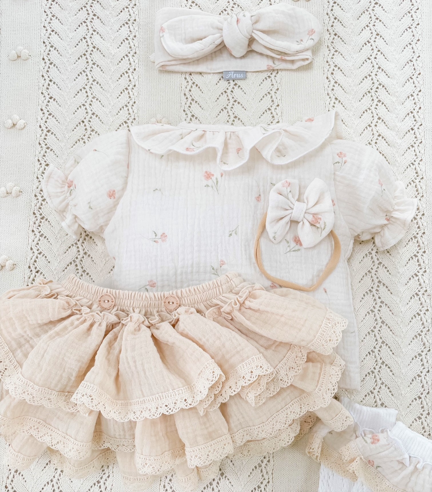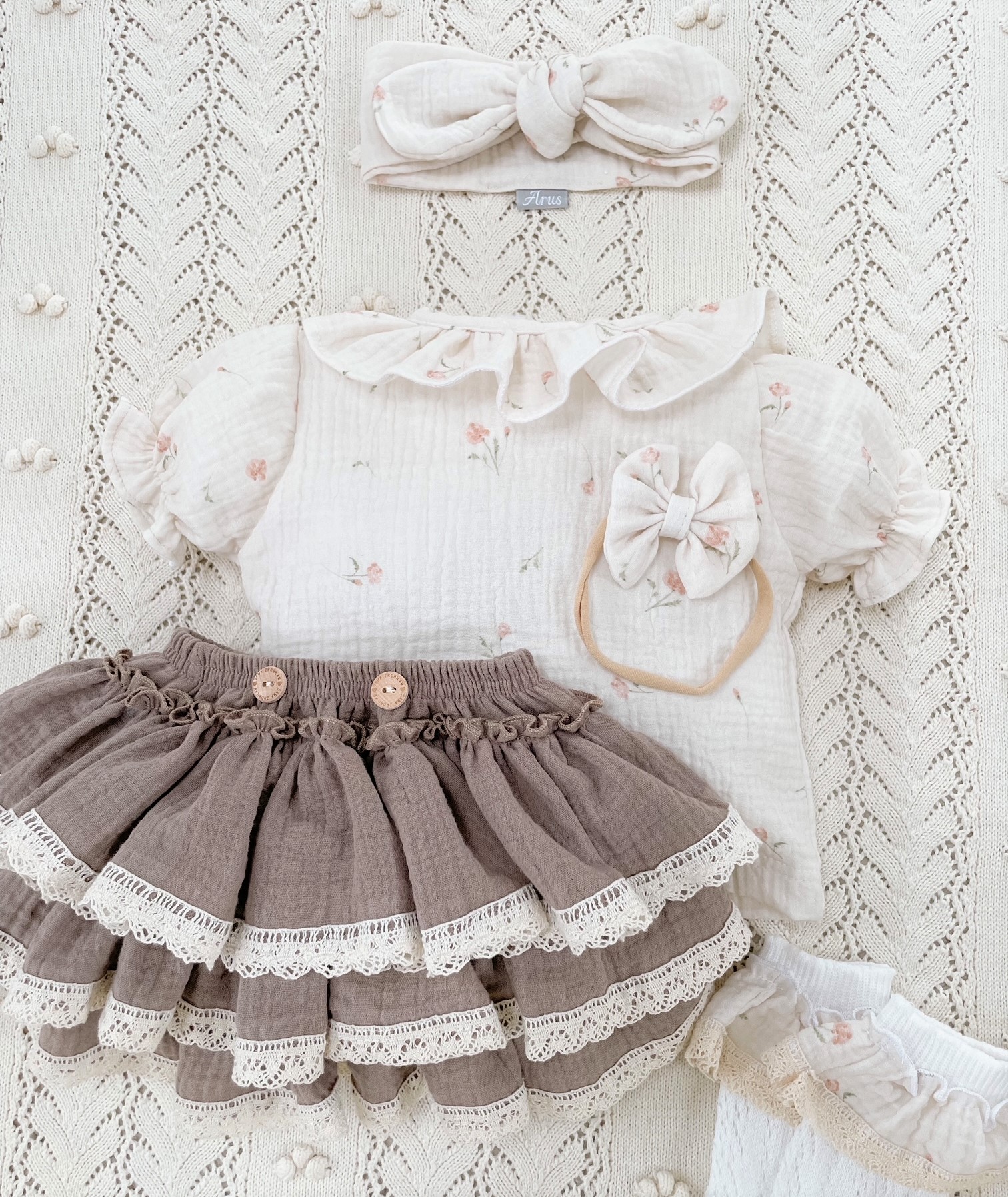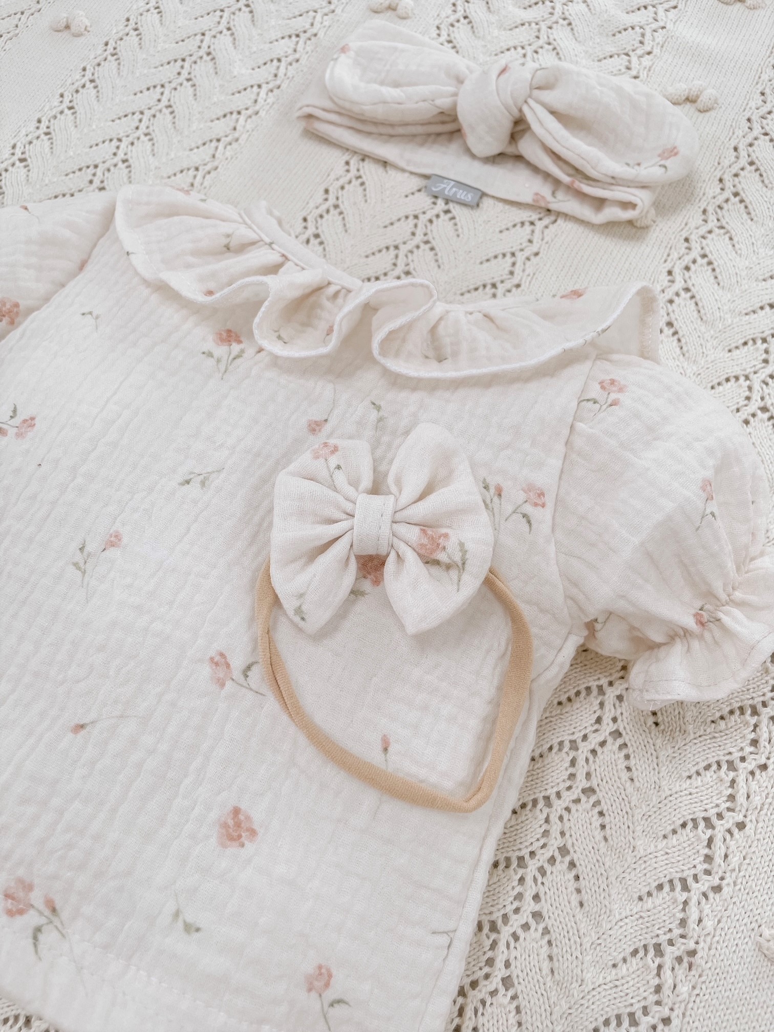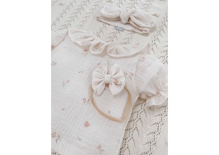 Muślinowa koszula ozdobiona falbanką z rękawkami typu bufki, uszyta ze 100% muślinu bawełnianego , z tyłu zapinana na drewniane guziczki. Niezwykle miękka w dotyku i komfortowa w noszeniu.