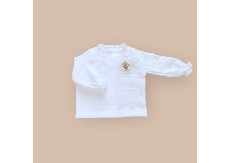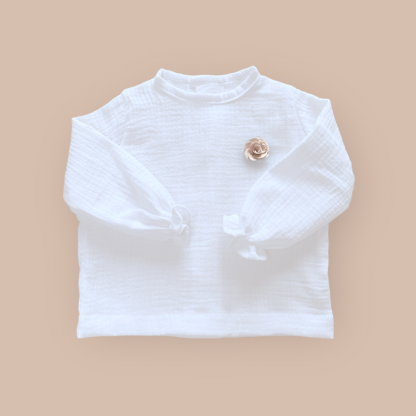 Muślinowa koszula ozdobiona materiałową różyczką z nowej kolekcji, uszyta ze 100% muślinu bawełnianego , z tyłu zapinana na drewniane guziczki. Niezwykle miękka w dotyku i komfortowa w noszeniu.