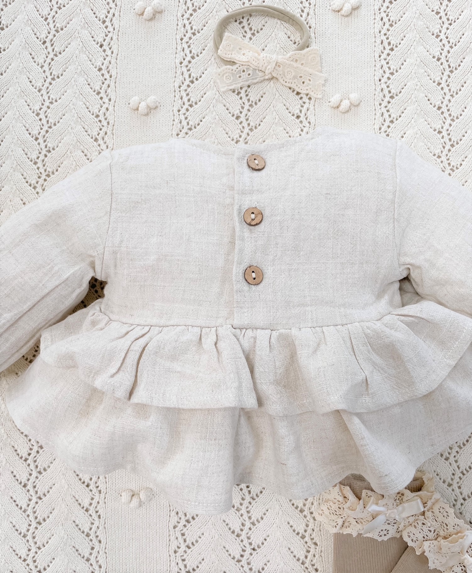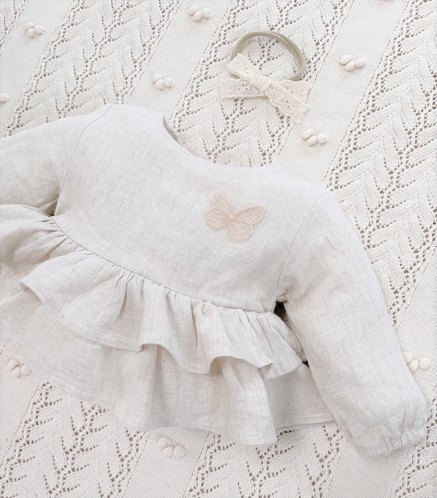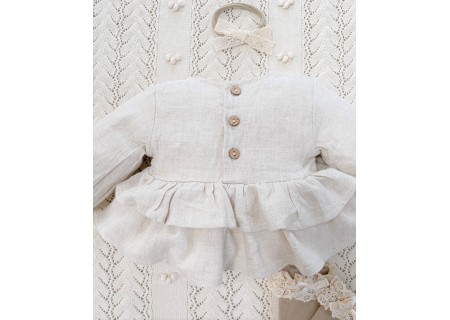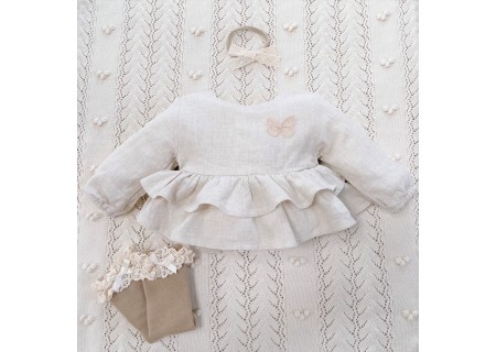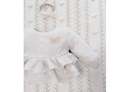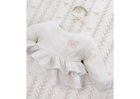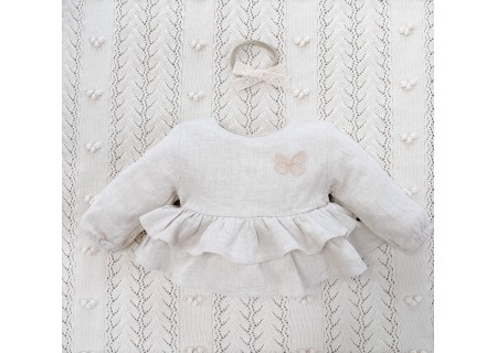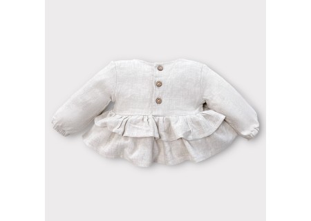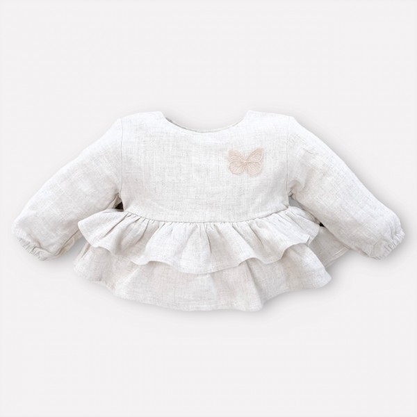 Koszula Butterfly of the Valley z falbankami zapinana na guziczki. Niezwykle przyjemna w dotyku i kontakcie ze skórą tkanina lniana. Przewiewna a jednocześnie mięsista.