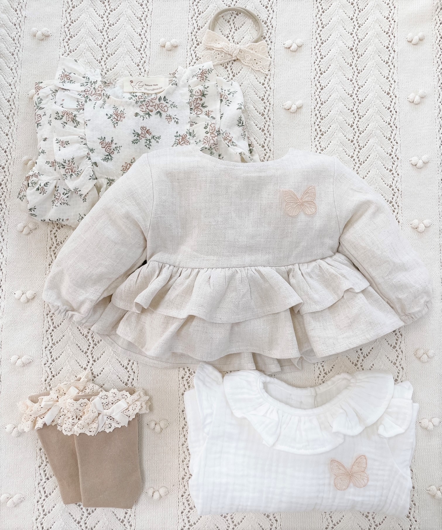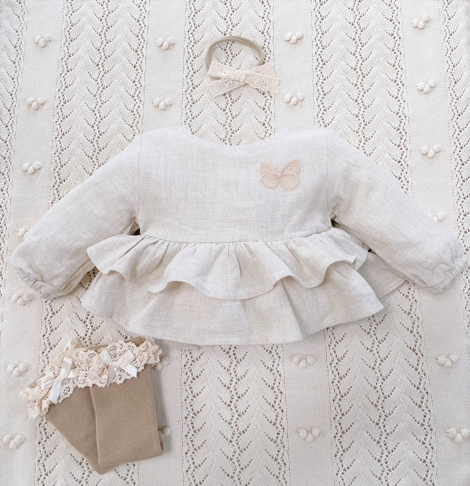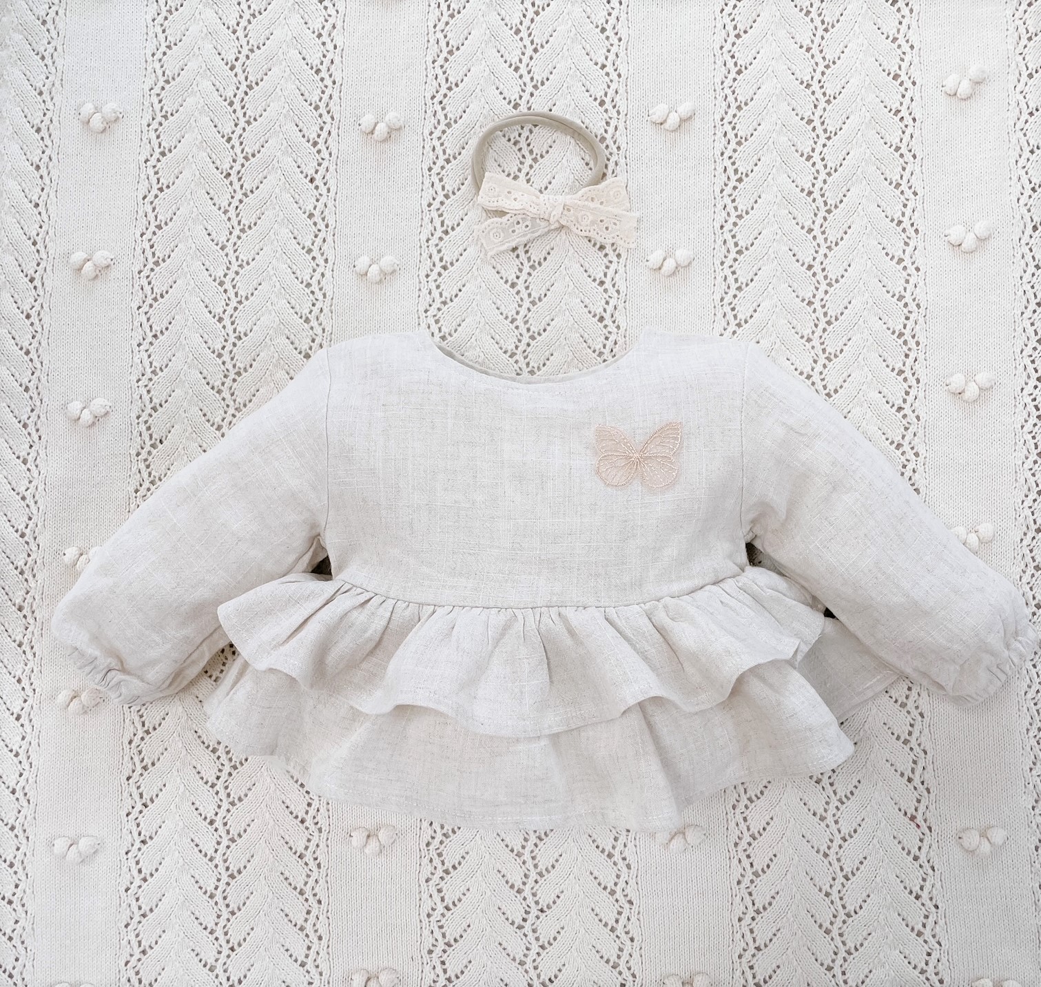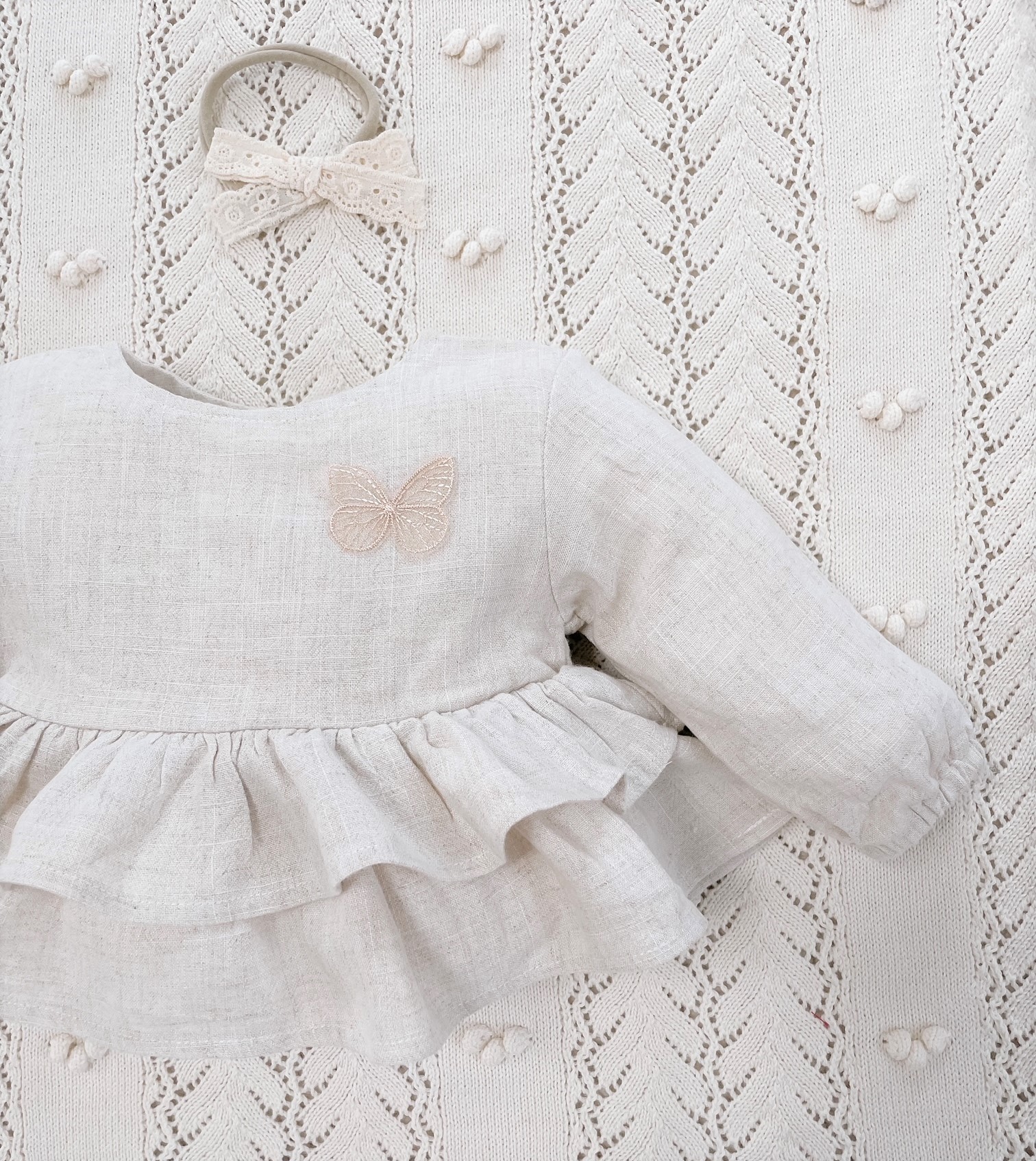 Koszula Butterfly of the Valley z falbankami zapinana na guziczki. Niezwykle przyjemna w dotyku i kontakcie ze skórą tkanina lniana. Przewiewna a jednocześnie mięsista.
