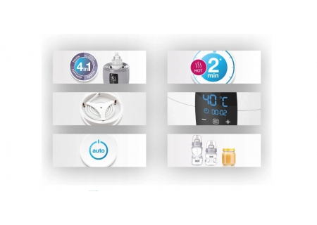 Szybko i równomiernie podgrzewa pokarm, utrzymuje temperaturę nawet do 10 godzin, stopniowo rozmraża pokarm, wyparza butelki i akcesoria do butelek