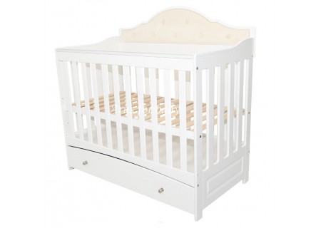 Od dołu szuflada na prowadnicach rolkowych, idealna na wiele rzeczy maluszka, wykończona frontem z ozdobnym fryzem pojawiającym się również na boku łóżeczka
