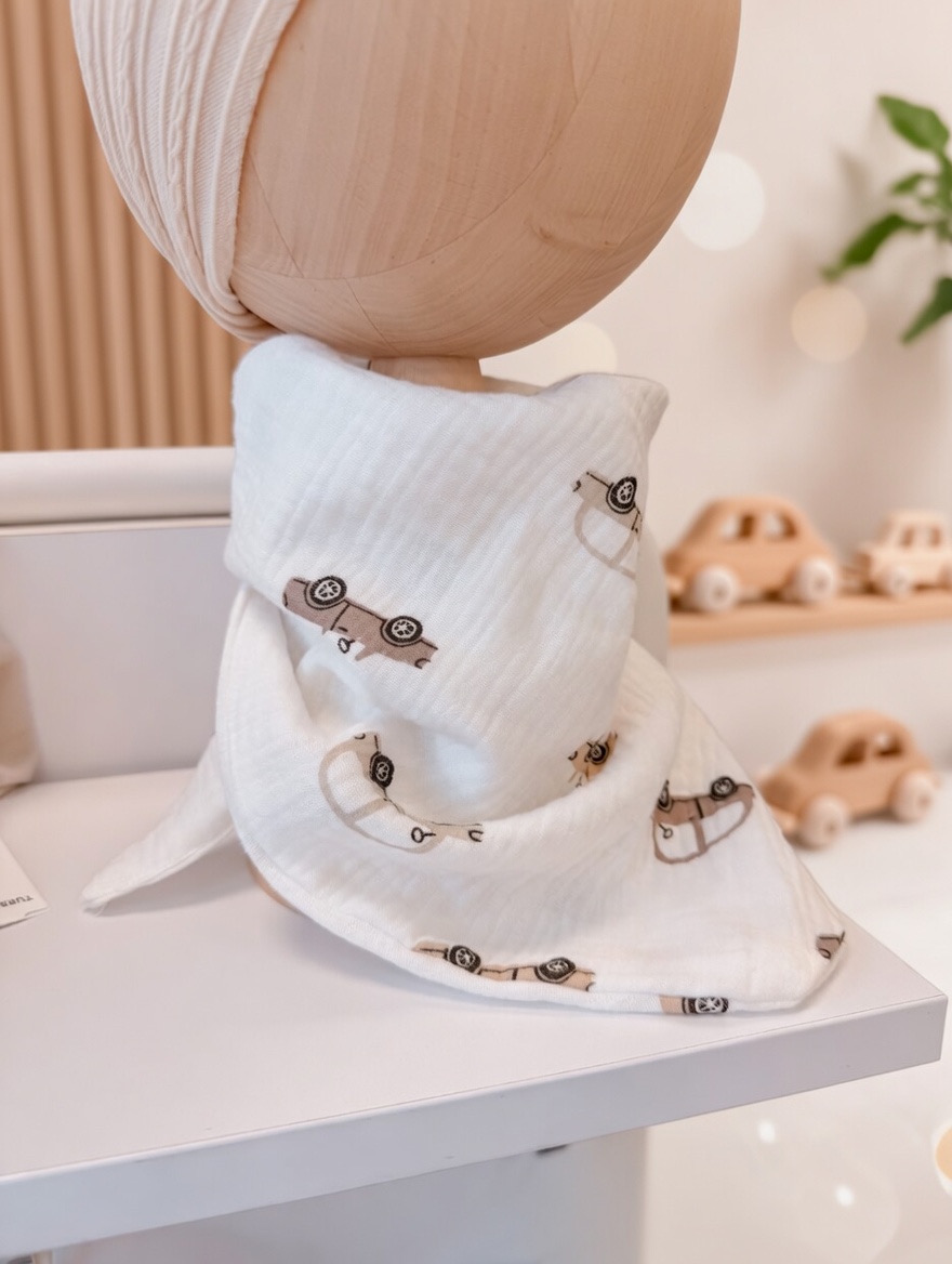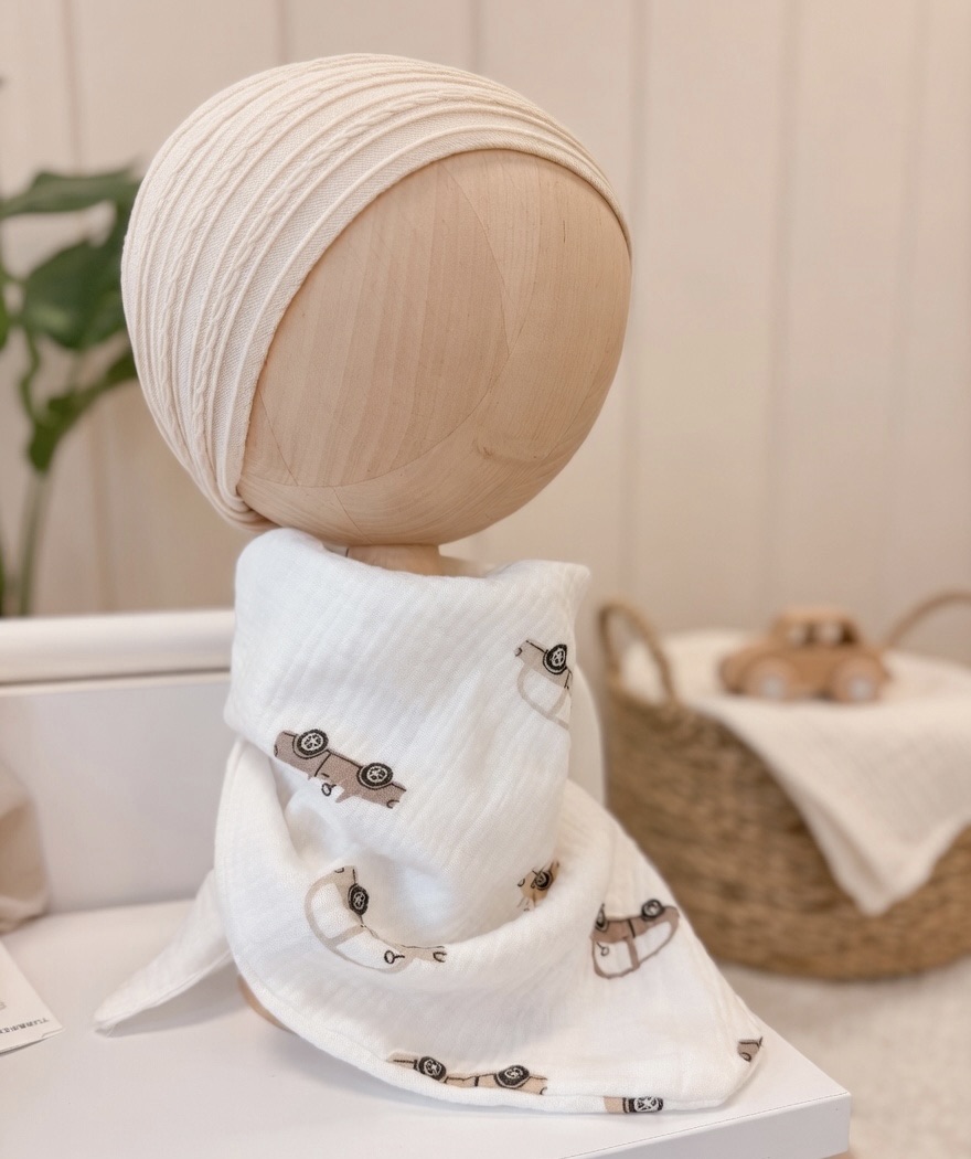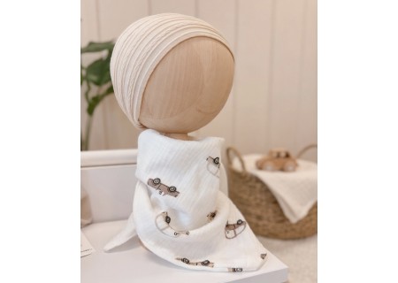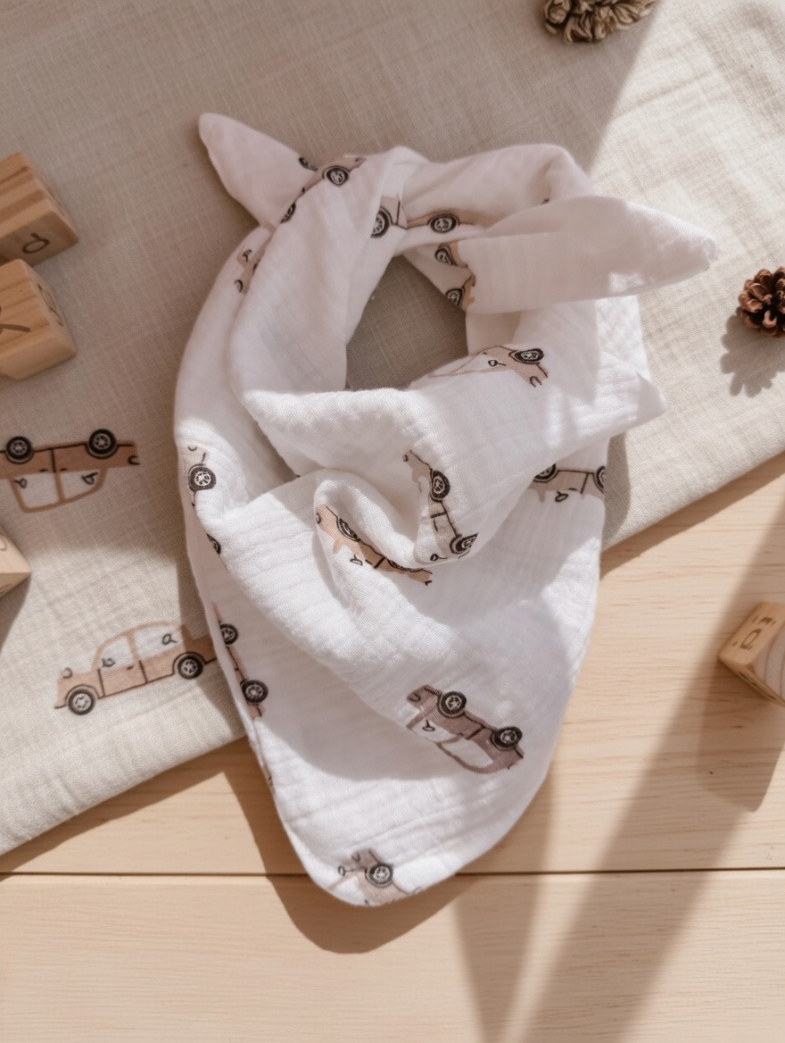 Ręcznie szyta chustka z 100% muślinu bawełnianego premium. Delikatna, lekka i oddychająca – stworzona specjalnie dla wrażliwej skóry dziecka.