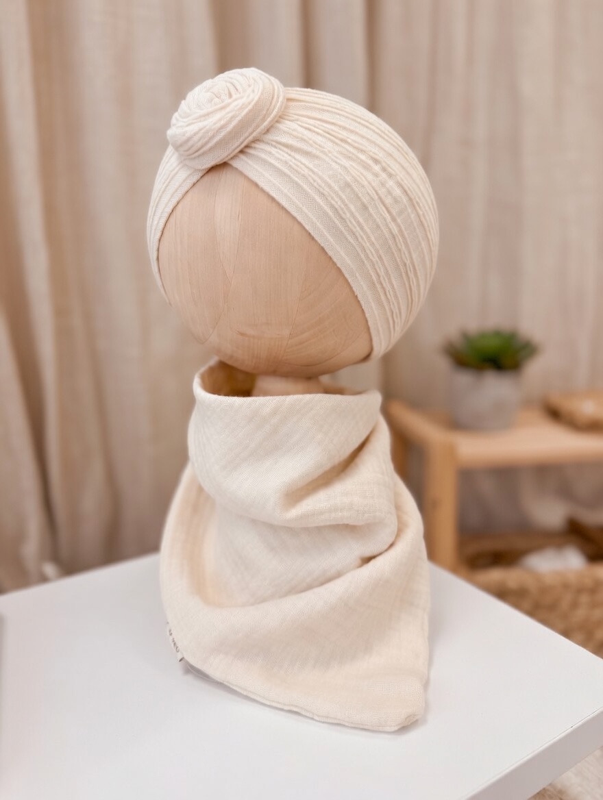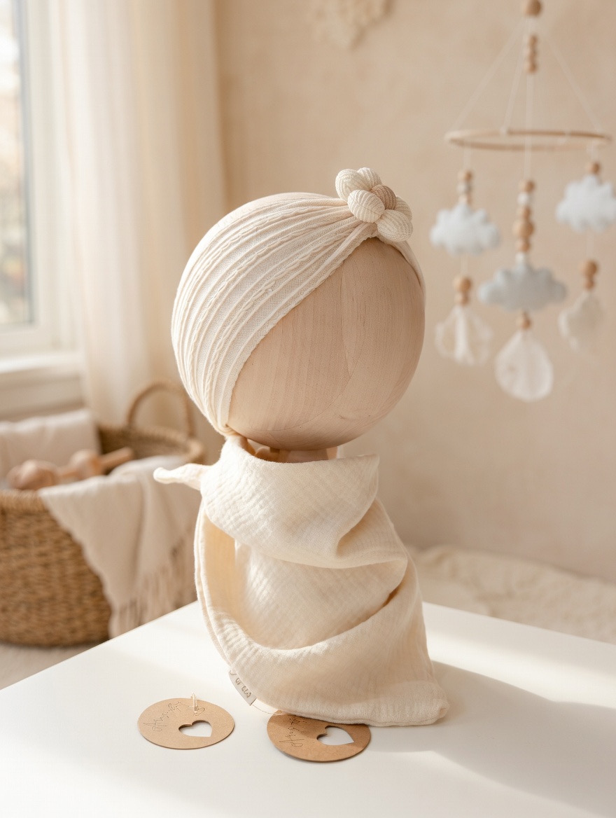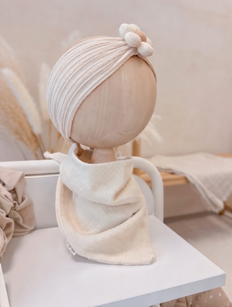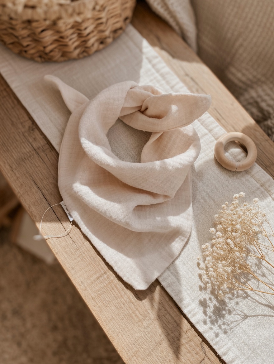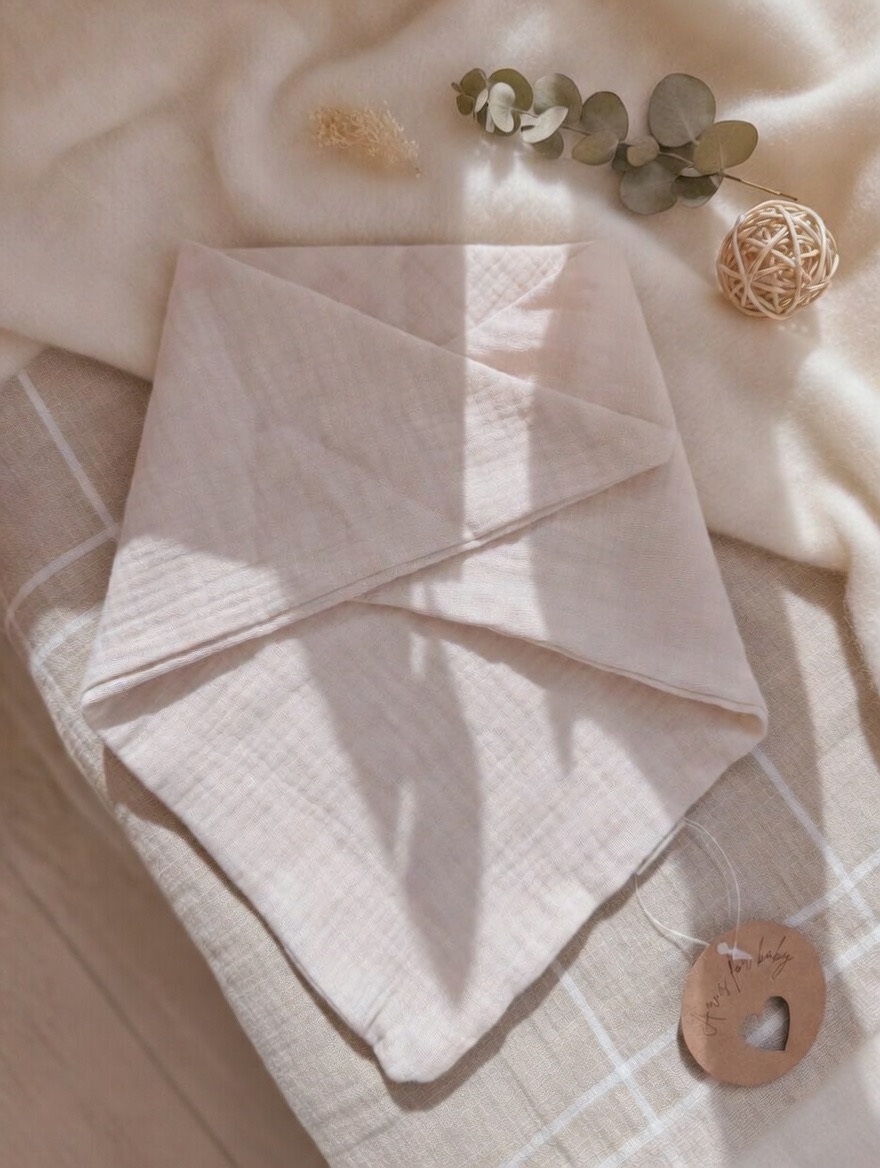 Ręcznie szyta chustka z 100% muślinu bawełnianego premium. Delikatna, lekka i oddychająca – stworzona specjalnie dla wrażliwej skóry dziecka.